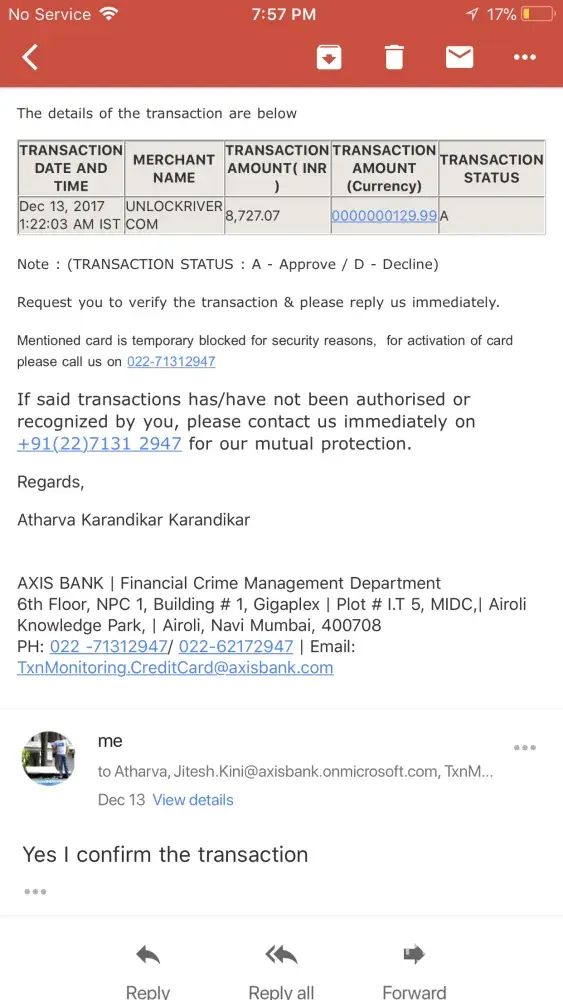 I have raised a request to unlock my iPhone 7 Plus from at&t United States and made payment of 139 USD from my credit card after which I never received any communication from unlock river on my request while my money got debited from my end. Neither I got my phone unlocked nor my money refunded. It's almost a week and am looking for some possible help in this regard.