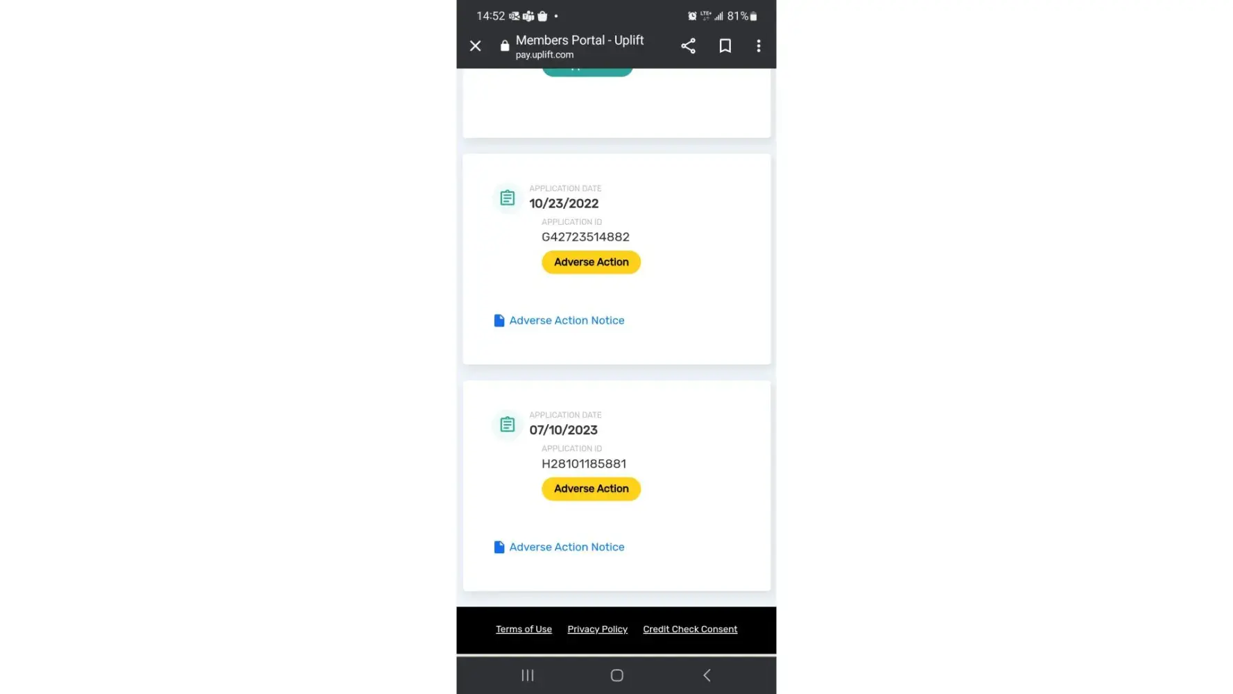 Did this ever get resolved? My husband and I have used Uplift at least 8+ times and this last time we both received the same exact denial. I verified my identify and received same reply. So confused as all of our accounts are in good standing with them and have great credit scores.