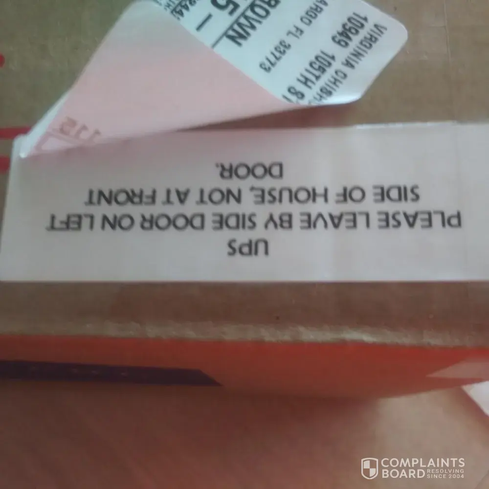 On Wednesday, 5/5/21 a package was left at my front door. The instructions on the box to deliver to SIDE door were covered by an UPS label.