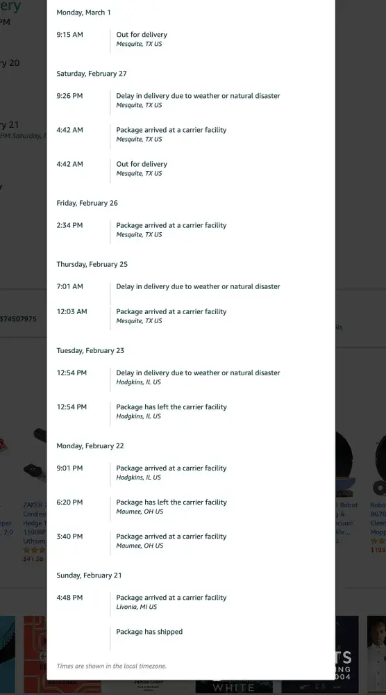 As you see in the attached tracking details the package moved to Mesquite TX from Livonia, IL in about 4 days. That is fine. It is such a long distance. However from 12:03 AM on 2/25 it has been with Mesquite UPS facility. My house is just about 8 miles from this facility and today it is 3/1 2:30 PM and still it is not delivered.