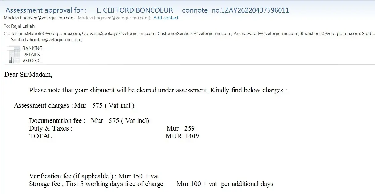 On the shipment's arrival to Mauritius, I got an email from UPS charging me imaginary brokerage fees representing 14.5% of the value of the item I ordered on delivery of my parcel to Mauritius where I am located. (See 2nd attachment).