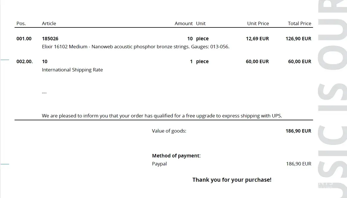 I live in Mauritius. I ordered a parcel of 10 sets of guitar strings (costing 126.90 Euros) as a present for my partner on 24/11/19 from a Germany-based online international Music shop (Thomann). I was informed that the parcel would be sent to me and that shipping via UPS would be 60 Euros. I accepted the order and shipping cost and paid by Paypal. I have attached a partial view of the receipt I received.