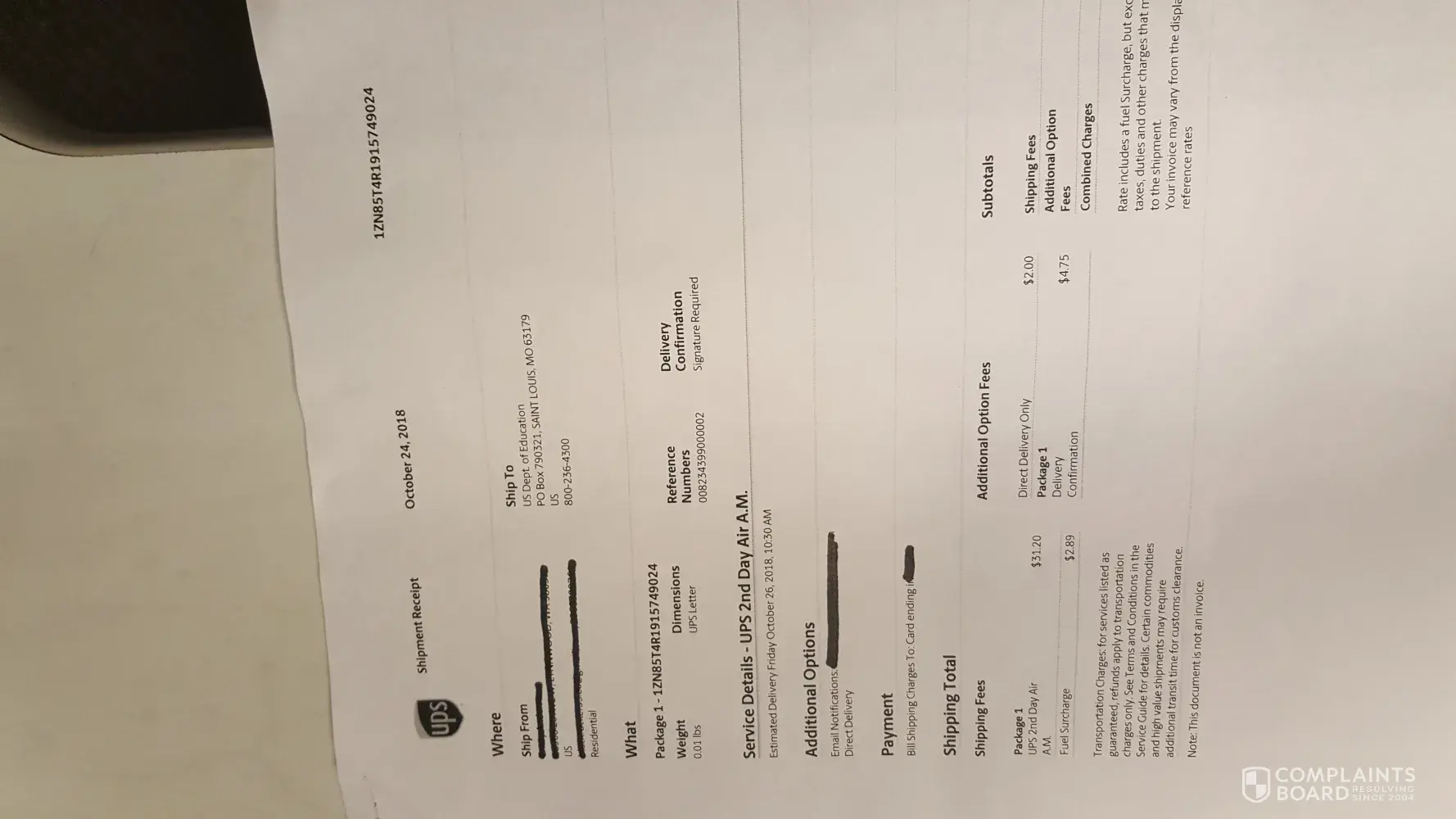 The address I entered was a PO Box (Dept. of Education) and selected the "2-Day AM" delivery, I added a signature and delivery confirmation for a fee. Clicked the necessary buttons, and a shipping label printed as well as, a receipt. My credit card was charged.