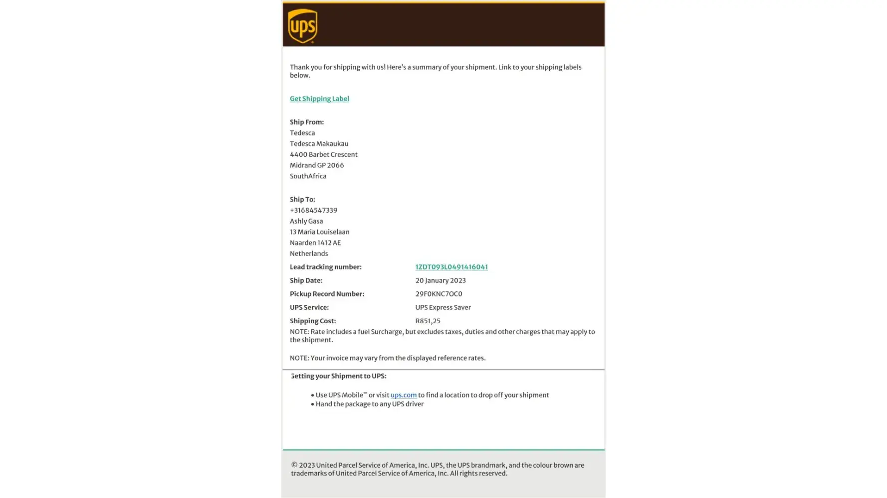 Date": on The 20th of January I got an online quote for transporting a 0,2kg parcel from South Africa to the Netherlands. After capturing the dimensions online, I got a quotation for R851,25. I paid online and received the following tracking number