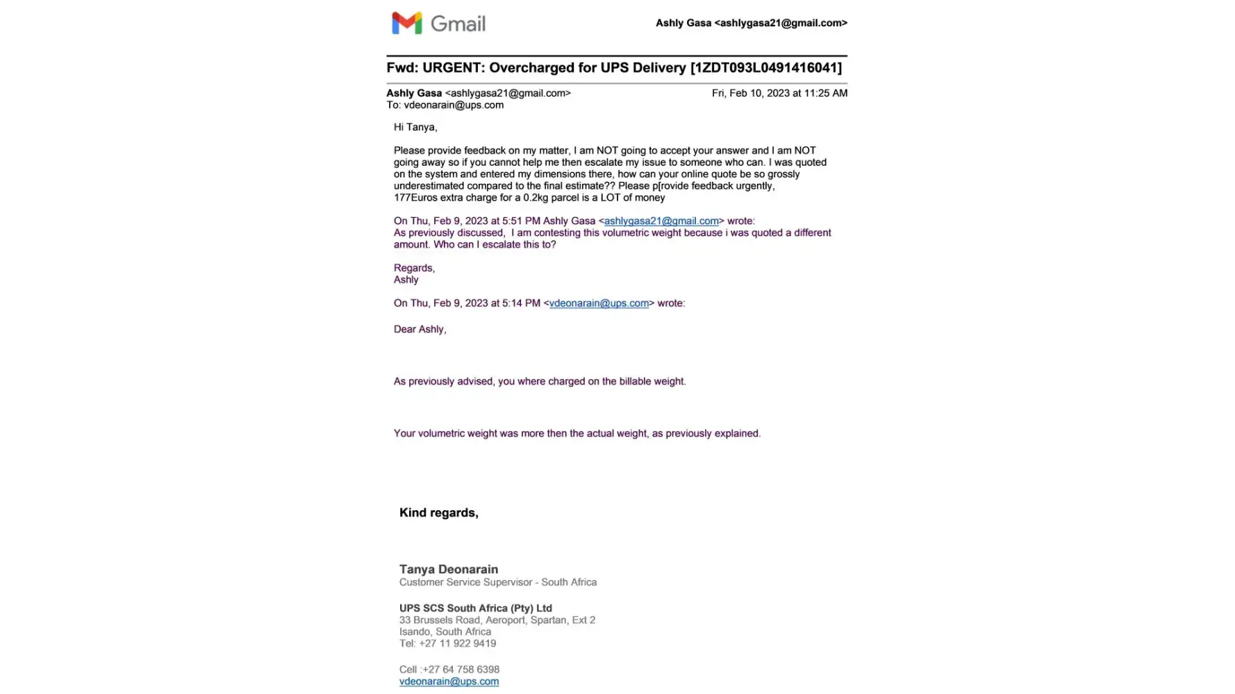 A week later on 27 January there was an unauthorised charge to my account of an additional 177 Euros. I immediately contacted UPS and for 3 days no one was able to tell me what the charge is for. The agents even went so far as to say they never debit client's cards. After a few more days of trying, I was eventually referred to Tanya who asked me to send her details of my complaint (see attached email). After reading my email she responded that I was charged on the volumetric weigh which turned out to be 2kg. The parcel I got delivered was roughly about 200grams ( I have offered to even send video proof of this) and when I did the quote, the system did ask for volumetric conversion. I have been overcharged and ended up paying more than 4 times more than the original quote. When I query this this I no longer get responses. Please assist with getting my refund