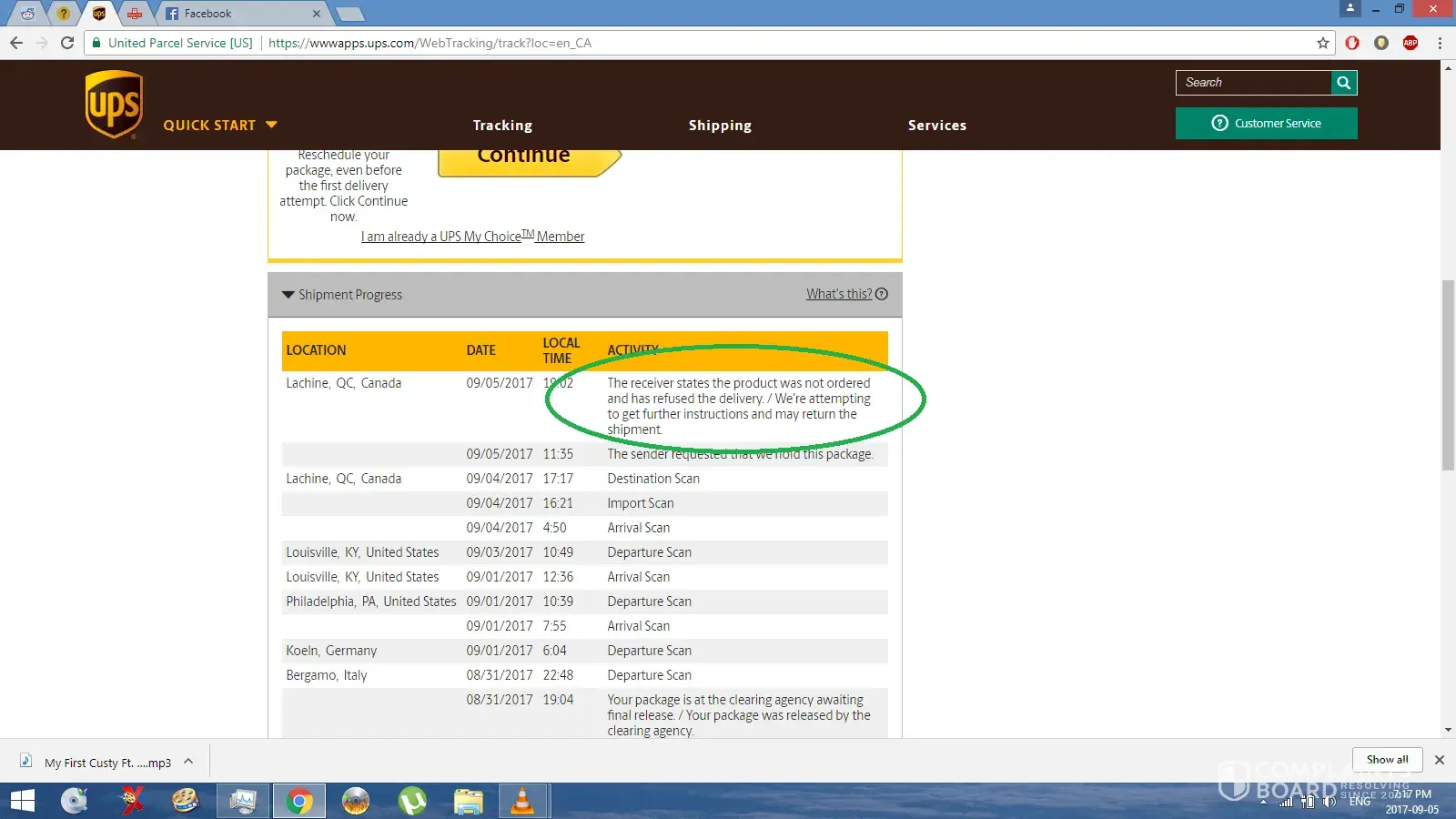 August 14, 2015: UPS delivery did not come. I called UPS 5 times to arrange for delivery for September 4, 2015 because I would be away for vacation.