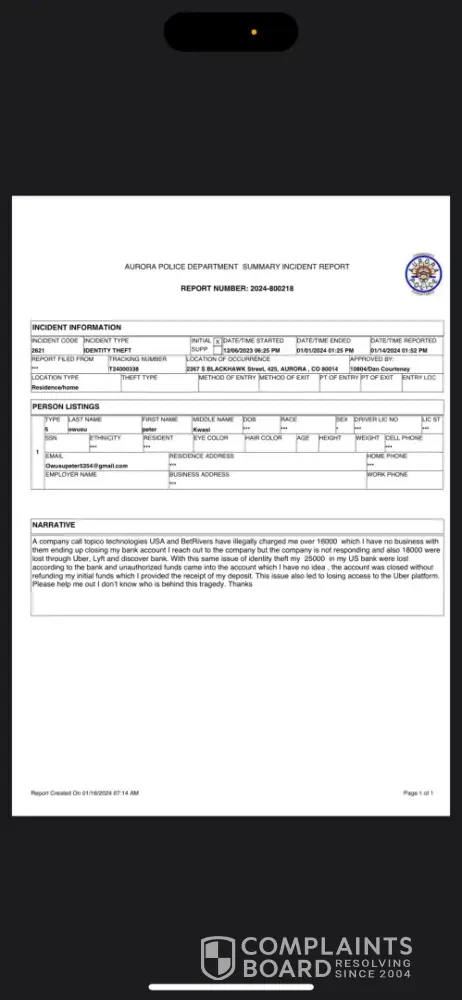 Claimed loss: 280K4 days of inability to use my funds and counting, numerous losses, personal and business.Business days lost in app build for company and web site completion.Employee payroll for such building