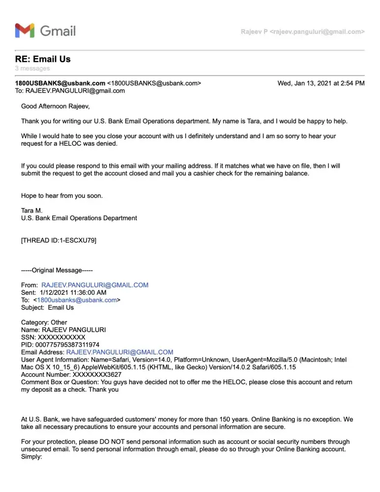 I started a HELOC loan with US Bank and they wanted me to have a checking account to qualify for a lower interest rate, but to qualify for a free checking i needed to have another service like a credit card. They said I did not qualify for a credit card with a credit score of 815 and an annual income of $500K. So I applied for a secured credit card and i was approved after a payment of $200. I then opened my bank account with $100 deposit. Then, US Bank declined my HELOC application. So I asked them to close my bank account. They sent me this e-mail.