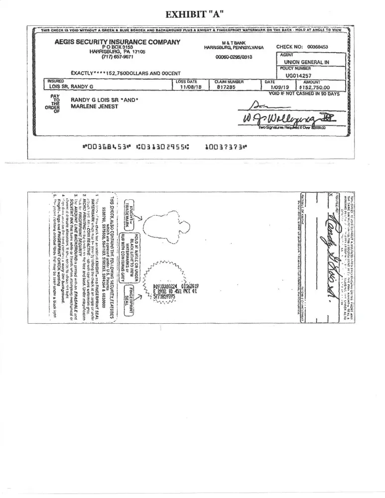 My ex-fiance, Randy G. Lois sr and I, due to the wildfires at paradise, ca, suffered a total loss of our jointly owned home on 11/08/2018. Our homeowners insurance co, aegis, issued a issued a joint check 01/2019, check no [protected] in the amount of $152, 750 (see exhibit "a"