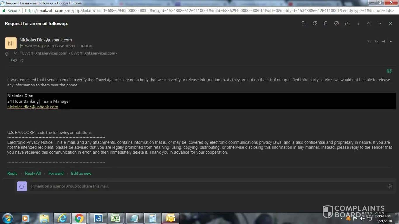 Two whom it may concern - my name is richard I am from fraud prevention team of flights services inc we are travel based company, I called at [protected] thi no# to verify the details as usual, just ot make sure that the charge we are going to made on you customer card are legitimate and I have exact detail that you have, I spoke with paddy one of your representative, she said they never v/f any detail to the 3rd party, I said her we usually v/f such kind of details but no one ever said this, I demand for her senior she put me on hold later came with mr nickolas diaz who introduce me as team manager trust me he cant manage, as he advice me the same is request them to mark me a mail stating the same, so he did, which is good I have already attached a copy, but question came here, I called again and spoke with lucinda, and see what happen she assist me with my query, and helped me, now I am curious that how come a policy can change in 5 min, 1st two person said there is no such policy but 3 agent verifies every thing, it means 1st 2 agent are not serious with the job, dear us bank this is something serious issue that you need to focus I have attached a copy of mr diaz email where he is saying that he cant help me
