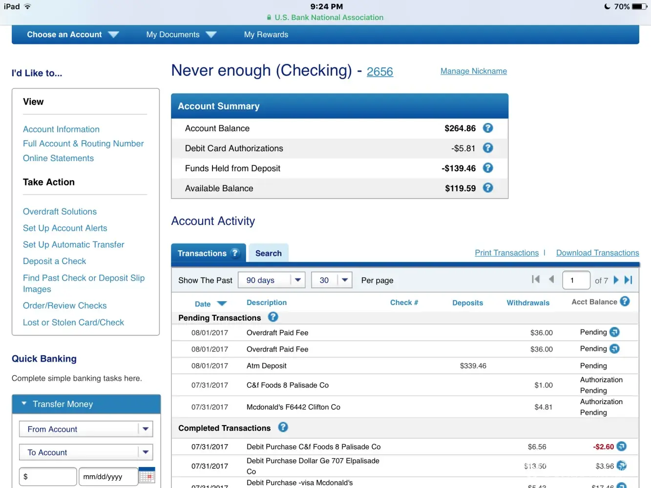 I’m the pictures I posted it shows I have money in my account, and no pending transactions that will affect my balance in a major way, I continued to spend money on necessities and ended up overdrawn by 400+ on my account plus the overdraft fees for each transaction. Illegal!