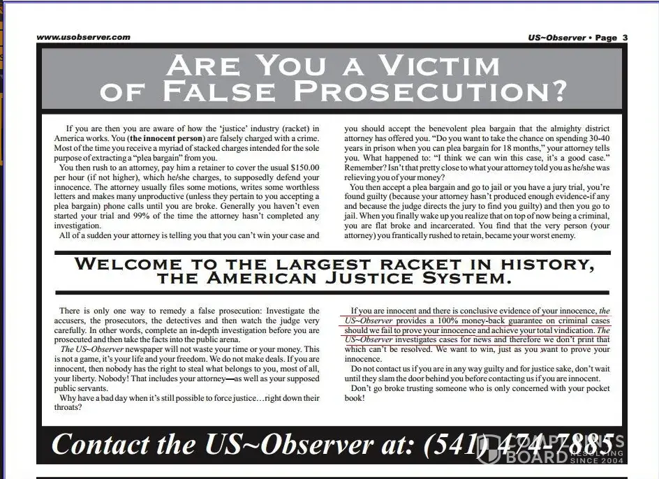 The US Observer has false advertised that Snook, US Observer has vindicated 3 cases every week for the past 25 years! This is not possible yet Snook advertises this false claim. Snook also claims he has a duel masters degree, which is also false. I called the University where Snook claims he graduated with a 4.0. and verified his duel master degrees. Snook claims he works with the Innocence Project, but this is also false. I have called to verify and no one one has ever even heard of the US Observer or Ed Snook at the Innocence Project. If Ed Snook really has vindicated 4, 000 plus wrongful convictions then he would be known by the Innocence Project, every judge, every district attorney all over this country. Snook and the US Observer would also be listed in the “National Registry of Exonerations.” The web site gives a detail description of this organization, who also has NEVER heard of Ed Snook, US Observer.Again if Snook’s claims were real, then he would be included in this registry.