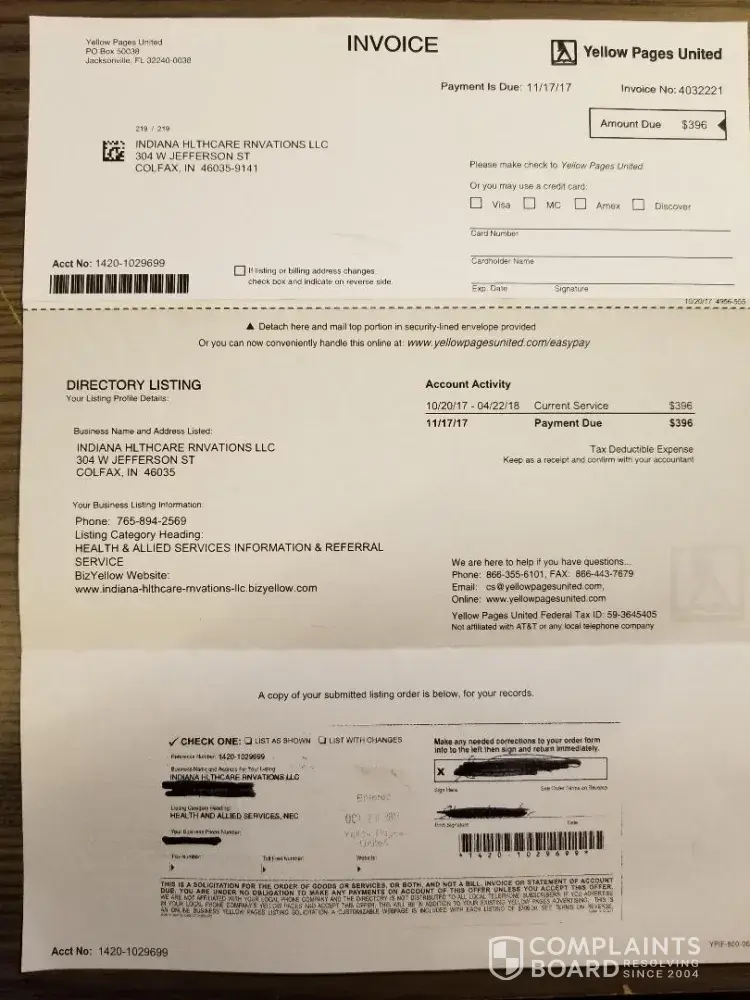Our business receives a "listing order form" from US-YELLOW Yellow Pages yearly (maybe more often). It states, "This is not a bill" in the upper right-hand corner and has a place for a signature on the lower portion, which is to be returned in the enclosed envelope, addressed to their Mail Processing Center at PO Box 41069 in Jacksonville, FL. The outer envelope says "Important Document Enclosed" so it appears to be an invoice. People from YP call repeatedly throughout the year, wanting to confirm our business information for a free listing or to update our supposed "current listing." One year, they sent us a bill, but the employee who spoke with the solicitor said he didn't order or approve anything. I started telling them when they call, "we're not interested; goodbye" and then hanging up immediately.