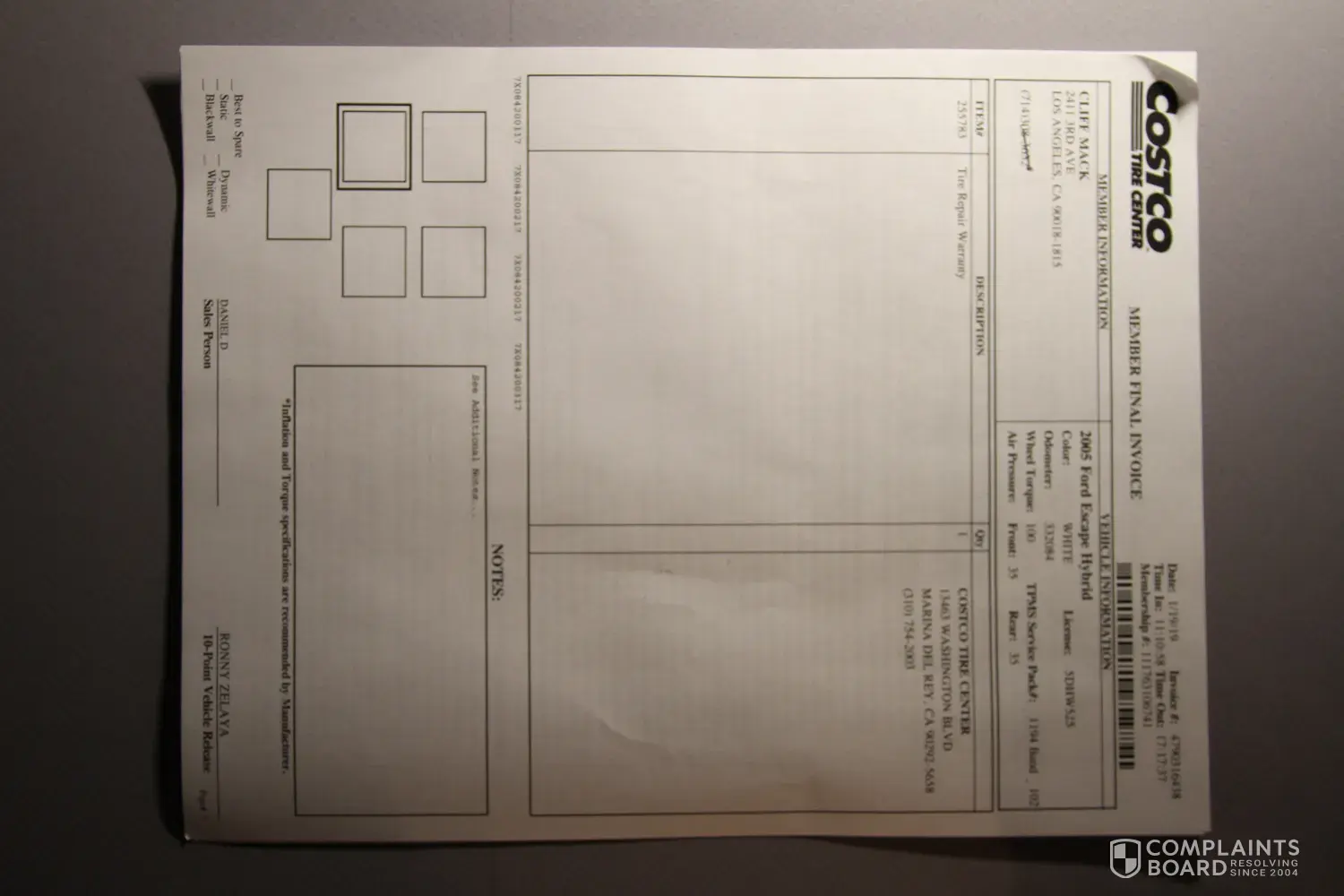 On January 19 2019. I went to the Costco Tire department, to get an nail in my left rear tire fixed. I arrived there at 10:30 am, one of the employees in the tire department said it would be at least 3.5 to 4hours, and i'll have to go to the front counter to proceed with the paper work. so i quickly parked the car, went to the front counter and there I waited 40 minutes in line to get served, with approximently 6 people ahead of me. one guy at the register to start. About 25 minutes in, they get an extra person to help. I then received paper work that stated time of process, at time in 11:10:58 am. time out 17:17:37 pm. On paper that is 6 hours later, not counting the 40 minutes waiting to Receive my paper work. Just for an nail in the tire that could take 10 to 15 minutes. This is unacceptable, Of the wait time. this should of been bump up in its time due to the Circumstance of task at hand. The time took longer than stated. Actual time arriving 10:30 am, time leaving 5:17 pm. The time spent at Costco is very unacceptable.
