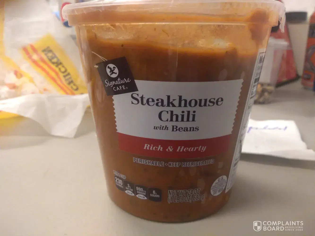 I picked up a bowl of the prepacked Steakhouse Chili from their Soup counter on 11/23/2018 around 9pm at 10321 Sepulveda Blvd, Mission Hills CA 91345. I was about to open the plastic seal when I noticed a green mold floating on top of the soup. I checked the expiration or the best consumption date on the bottom of the bowl and it is dated 1/23/2019. This is not only disgusting but it danger to public health. In my opinion, recycling old food is one of the store best practice. Pls tell me how can a mold grows in a freshly made soup ? You just lost a good customer.