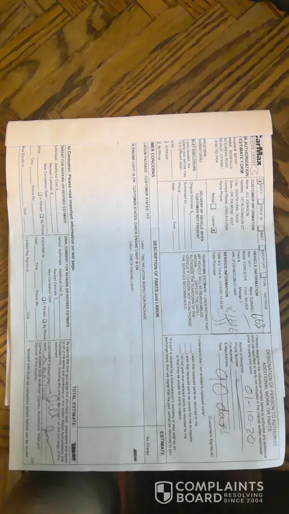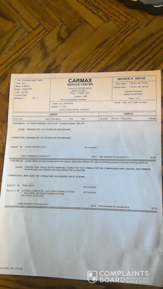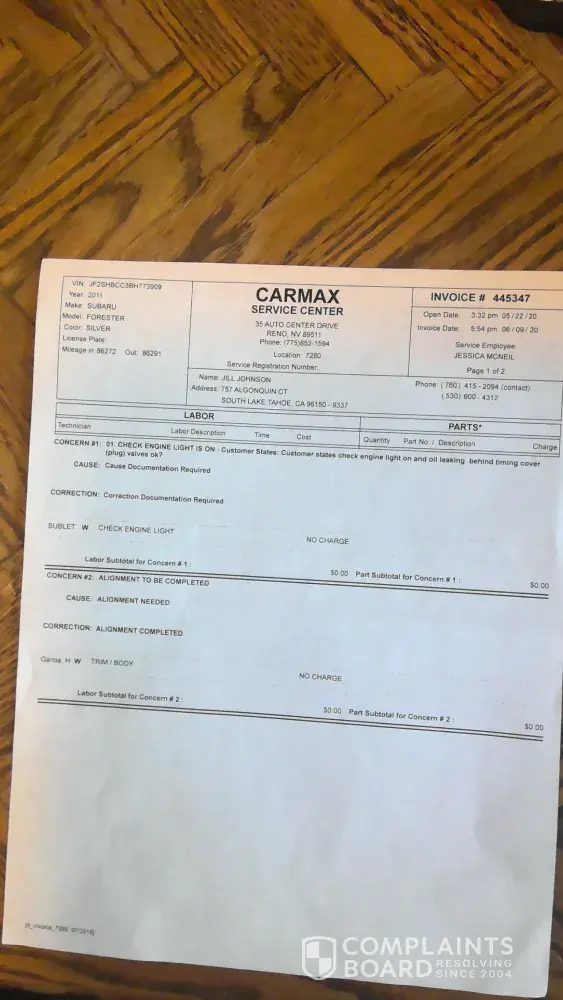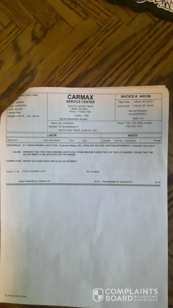 I bought my car on December 14, 2019 in Peoria, AZ. I took it into CarMax Roseville, CA January 01, 2020 for check engine light coming on for the first time while owning vehicle. CarMax said they did a diagnostic test of the engine light and engine performance. They replaced the ignition coil. Check engine light came on again, scheduled an appointment for March 25th, 2020. March 18th, 2020 I received an email stating all stores have temporarily closed because, of the pandemic. CarMax said they will be in touch again to reschedule. Did not hear from CarMax again, till I reached out and was scheduled an appointment for May 18th, 2020. I was driving around a car with a check engine light for 2 months while CarMax was telling me there was nothing they could do for me at this time because of the pandemic. I still worked at this time, and needed my vehicle. May 18th, 2020 CarMax diagnosed the vehicle, found misfire codes for 3 of the 4 cylinders. Found valves need to be readjusted and referred me to Christensen Automotive for valve job. Called Carson city, NV Christensen Automotive to schedule an appointment. I live in South Lake Tahoe, CA. Carson city, NV referred me to the shop in South Lake Tahoe, CA. When I turned my car into Christensen Automotive, South Lake Tahoe, CA May 21st, 2020 they found there was oil leaking from the timing cover. Mechanic was amazed that I had just taken my car to be looked at, at CarMax Reno, NV, and; was not informed the whole bottom side of my vehicle was splattered with oil. Christensen Automotive filled my car with oil and said best option because, it was still under warranty. Was to take it back to CarMax Reno, NV and have them send it over to Subaru Lithia Reno, NV for best parts and service. Drove straight to CarMax, Reno, NV on May 22, 2020 and received my car back June 09, 2020. From this visit they allegedly sent my car over to Subaru Lithia Reno, NV for the leaking oil. I was not given that paperwork of my car being sent over to Subaru Lithia Reno, NV. CarMax also fixed my alignment on this visit. Check engine light came on again day of receiving my car back, June 09, 2020 while back in South Lake Tahoe, CA. Was not able to bring car back to CarMax Reno, NV till June 16th, 2020. Received my car back June 30th, 2020. Vehicle was sent to Subaru Lithia Reno, NV June 17th, 2020 where a diagnostic test was ran and found misfires on cylinders 3 and 4. Spark plugs were pulled and cleaned. Oxidization and ash were found but no further action was taken. Oil leak from timing cover was never resolved. When car was taken back to CarMax they noticed the a/c was not working and fixed that as well. Subaru Lithia Reno, NV told me I drove the car too hard and on the way back home, when I put gas in, I checked all fluids and my oil was completely dry. This was sitting at Subaru Lithia Reno, NV for 2 weeks. The check engine light no longer comes on. It still does not shift right, Leaks oil constantly, has blown transmission seals, continues to leak from transmission, and metal found in transmission.