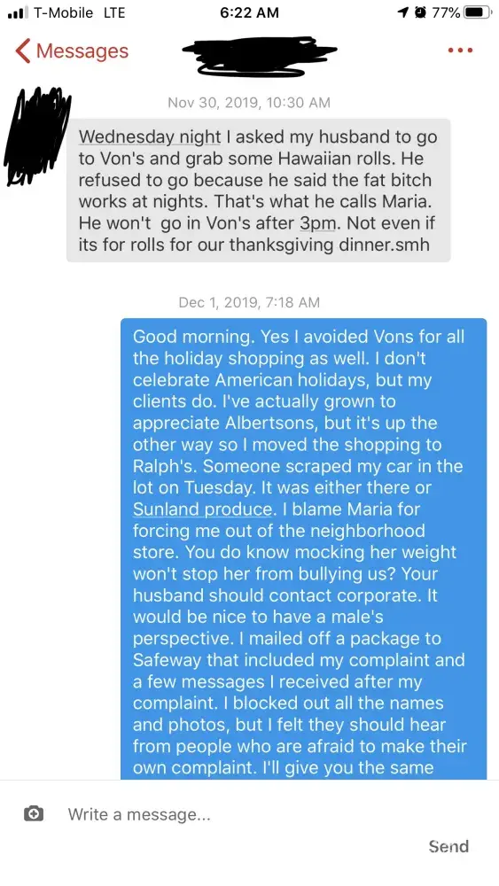 Whiny? My kids call me a cry baby. They’re young and likely troll the net just like you all do. I’ve been crying for our troops all week. Couldn’t get through a full prayer without breaking into tears. The news that there were no American casualties with the recent rocket launches brought even more tears and reinforced the fact that prayer works. My tears don’t justify Maria’s actions nor the actions of those who enable her. Scared? Try terrified! She’s bigger than me in every aspect, and with the recent surge of ms13 in our area and not knowing her affiliation, I’m much more than scared. I concede that I am very emotional, shy, timid, and I confess that it breaks my heart that this can happen on American soil with an American company. If this were Vallarta I might be able to understand, however as an American I shouldn’t be made to feel uncomfortable or be treated badly because I’m not Mexican-American.