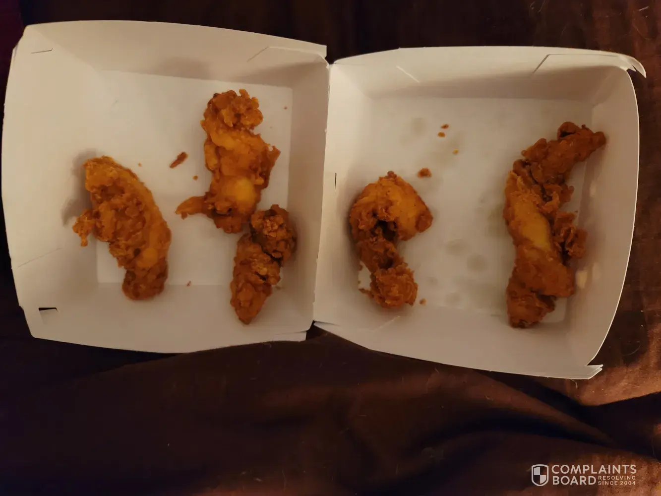They were so small they didn't fill up the container as you can see from the picture below. They were barely 2 inches long and barely wider than my thumb. They were more like popcorn chicken than tenders. The first time I ordered they were small but I just that was a one time thing. However, when I purchased them last night I believe this is the product they regularly put out. It may be one of the closest fat food places but I won't be going there again!
