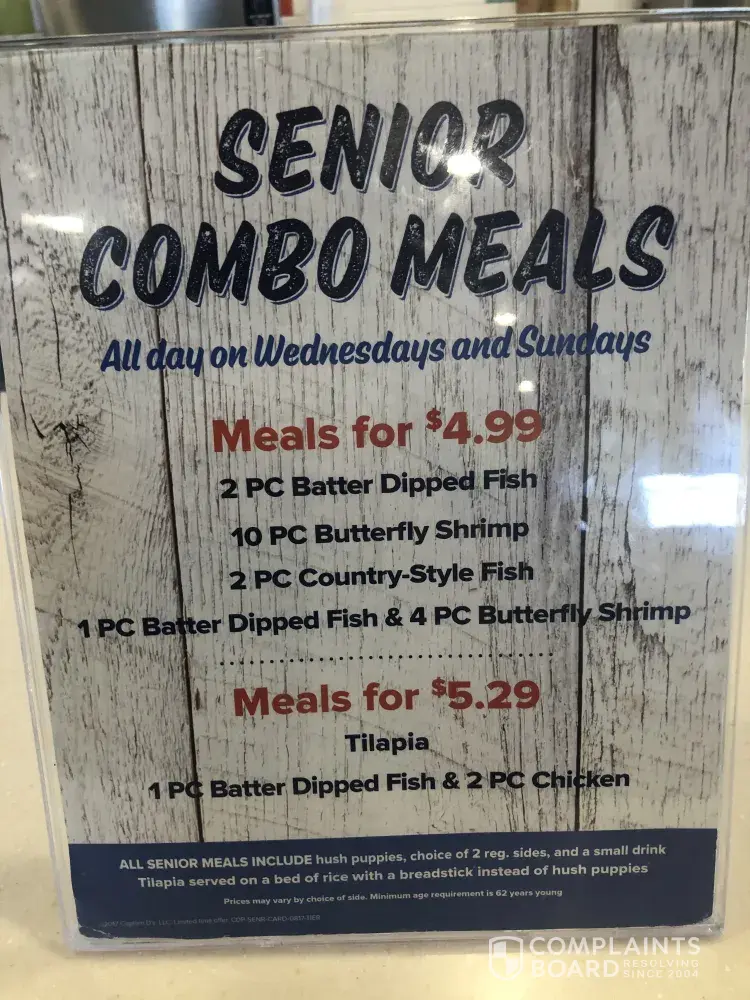 On Sunday October 13th I went into the Crestview Captain D's to buy my 84yr old mother lunch. My mother is on hospice and is unable to leave home so I asked if I could take picture of the senior menu. I took a picture and texted it to her and she texted me back what she wanted. When I ordered, they told me I could not get her senior discount since she wasn't with me. I explained her terminal illness and how my sister gets her food every week at the same Captain d's and it has never been a problem. They reiterated that the manager told them they couldn't do it anymore. I asked to speak with him and explained that if you claim to be a senior friendly restaurant then you need to realize that all seniors can't get out of there homes and have loved ones pick up their meals for them. He was very polite and said if my mom comes with me through the drive thru she could have the discount. Really? She has a terminal illness and is on hospice and you think she can come through the drive thru? I mean wow, just wow. The senior discounts are only offered on Sundays and Wednesdays anyway. I mean is theft by deception of using a senior discount a big problem at your restaurants? If y'all are going broke by giving out senior discounts then captain d's is on the way out. I can walk in to any chick-fil-a or McDonald's and ask for a kid's meal without a kid and no one gives it a second thought. Please correct this, either truly offer a discount for ALL Seniors..even the ones who can't make it in to the restaurant. (If people faking is THAT big of an issue then I would gladly get my Mom's doctor to fill out a form so you can keep it on file) It makes my mom happy to save a little money. It makes a lot of seniors happy because they are on fixed incomes.