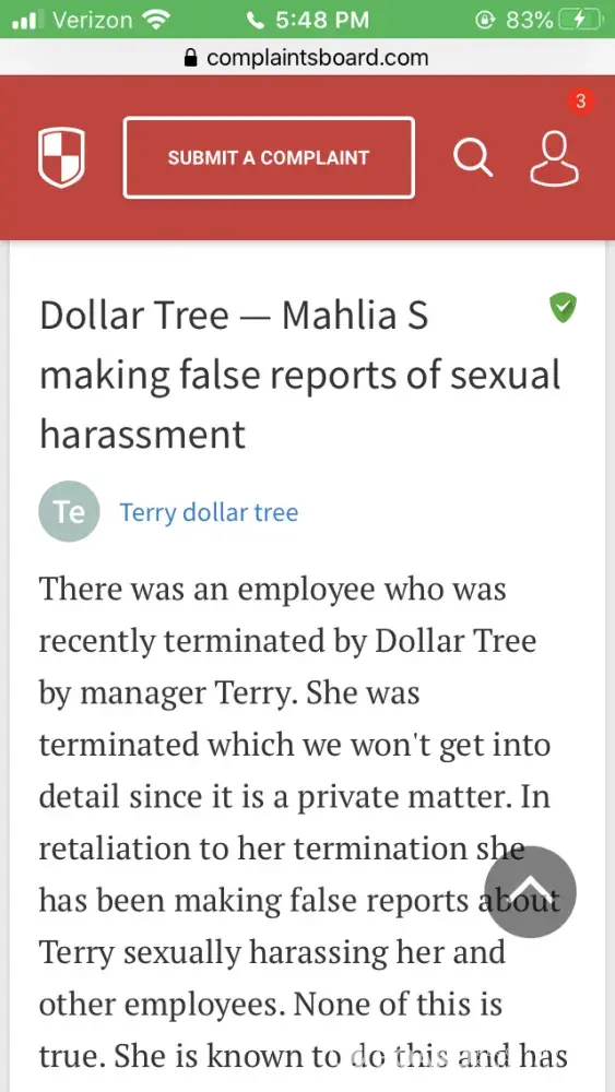 This is mahlia Sampson the head manger at the dollar tree ms Terry has changed my name TAttedupLiaa3kx to TAttedupLiaa3k there is now two complicate board accounts my account TAttedupLiaa3k my account I mahlia Sampson is the one with a picture must I emphasize MINES IS THE ONE WITH THE PICTURE and the one without a picture is the one ms terry made up herself she saw my complaints and changed my name to match my true complaint board account my true account is the one with a picture the other one originally had an x and the end spelled like TAttedupLiaa3kx but now it's TAttedupLiaa3k and now she is trying to make it look like I wrote that statement that said I wanted to tell the truth and that is not me and I did not write that statement my complaint board account is the one with the picture on it the other one without the picture is ms terry who made a fake account with the same complaint board account name as me TAttedupLiaa3k but mine has a picture on it and the other which is me terry's does not and I did not write that statement saying I wanted to tell the truth I was being sexually harassed by ms Terry and I will not stop writing complaints until this issue is resolved she made me feel violated and sexually harassed for 4 whole weeks now until I was fired yesterday she always use to touch me and put her arm around me and try to make me get in the car with her I am telling the honest truth she has made a fake account With the same name as my complaint board account but different is Mae I emphasize mine has a picture above and the other one does not but before the other one had an ex at the end until she seen that I made another complaint and remove the X and try to make it seem like I made two accounts but I did not with the same name as my complaint board account but different is may I emphasize mine has a picture above and the other one does not but before the other one had an X at the end SPELLED LIKE TAttedupLiaa3kx until now she seen that I made false accusation complaint and removed the X at the end and left the 3k spelled the way my true account is spelled but The difference is may I emphasize MINES HAS A PICTURE ABOVE THE OTHER DOES NOT I have a screenshot of the other account before she change the name to match my name and try to make it seem like I Wrote that statement And I did not that was her ms terry making a fake account with my complaint board account name if you go investigate the false report she made you will see that there is two Complaint board accounts THE DIFFERENCE IS MINES HAS A PICTURE ABOVE she changed my name to TAttedupLiaa3k but originally it was TAttedupLiaa3kx and I have a screen shot of where she removed the x at the end and I already have a account that is TAttedupLiaa3k that has a picture above please call me at [protected] I want her fired she sexually violated me and harassed me every shift I had with her I never changed my story about her sexually harassing me she made a account that has the same name as my complaint board account difference is May I emphasize again one more time is that mine has a picture above and she originally had it spelled as TAttedupLiaa3kx but now she changed it to TAttedupLiaa3k and she removed the x at the end my complaint board account which is TAttedupLiaa3k WITH THE PICTURE ABOVE and with 4 multiple complaints I will not stop until this issue is resolved she has been doing very nasty things to me and I feel so dirty and violated please call me [protected]