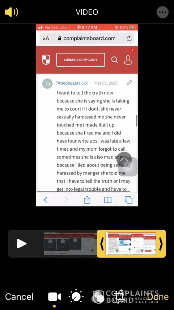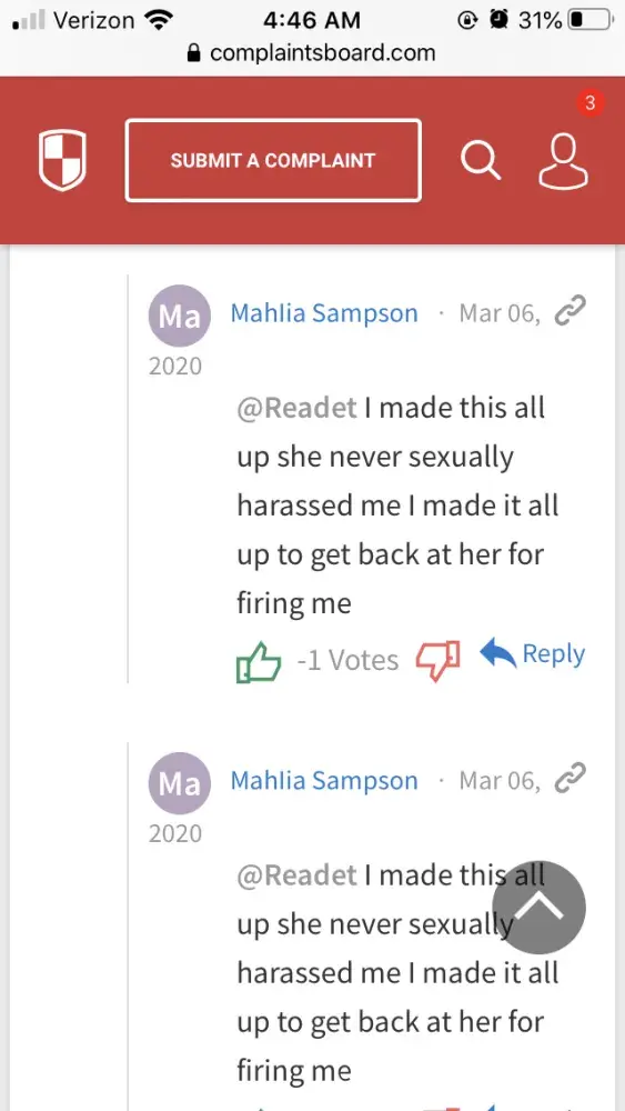 This is mahlia again she has changed her complaint board account name to @readet but it was originally @Ratery she thinks she is going to get away with writing a false statement by making a fake account that has the same name as my original complaint board account which is TAttedupLiaa3k but the difference is mine has a picture above and 4 multiple complaints and I am adding more and telling you more details about how she was sexually violating while I was working there she use to always try to touch me and rub on me she always use to put her arm around my neck and you can look at the cameras there is proof and now she has made a fake account that has the same name as my complaint board account they are both spelled the same but the difference is my true complaint board account has a picture above and 4 plus complaints she originally had a x at the the end of the fake account and I have proof there is a picture below and the statement that she wrote and I did not write that statement she did me terry she is trying to cover up her sexually harassing me and violating me and she has just now changed her name on complaint board to @readet but originally was @Ratery and I have proof of that also there will be screen shots below
