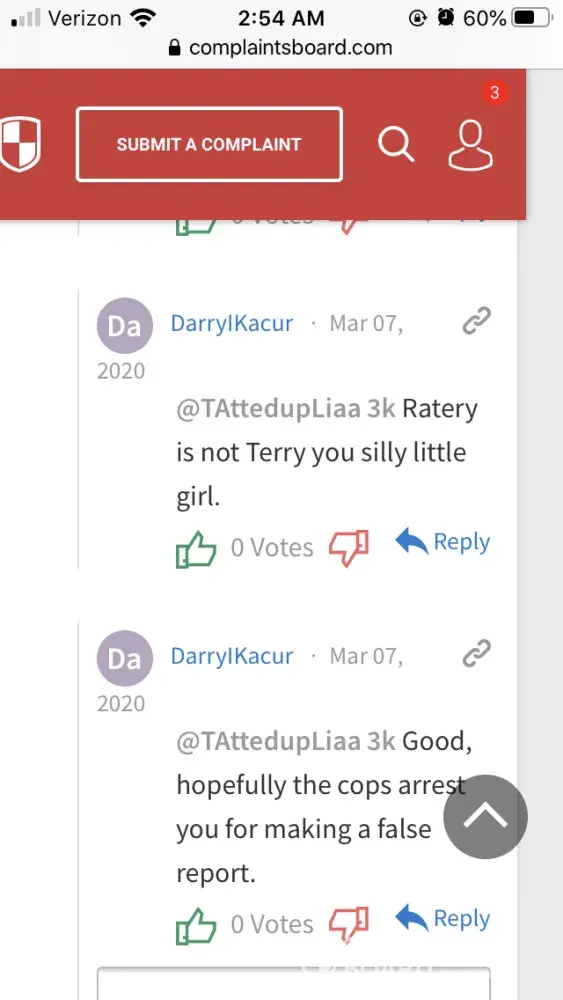 March 6 you ms terry posted that comment and that is not my account that is a fake complaint board account ms Terry has made pretending to be me and I have proof of everything today is March 9 ms Terry you know you are wrong and god knows it to so I’m off this [censored] the cameras will show