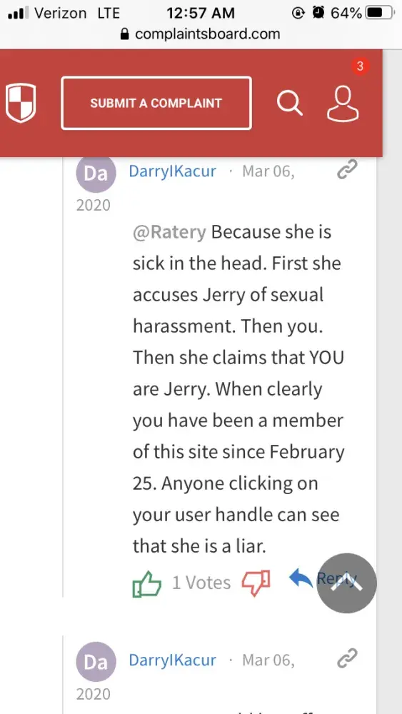 @Ratery is terry and and you probably are to darry I know she ms Terry has multiple fake complaint board accounts claiming to be me and she is trying to cover up her sexually harassing me she already had a complaint board account I did not falsely accuse her SHE DID TOUCH ME SHE DID SEXUALLY HARASS ME SHE DID SEXUALLY VIOLATE ME and I am not changing my story never ever ever I never lied about ms terry touching me she did SHE DID SHE DID and I am never changing my story ms Terry is so sick in the head 🤮🤮🤮
