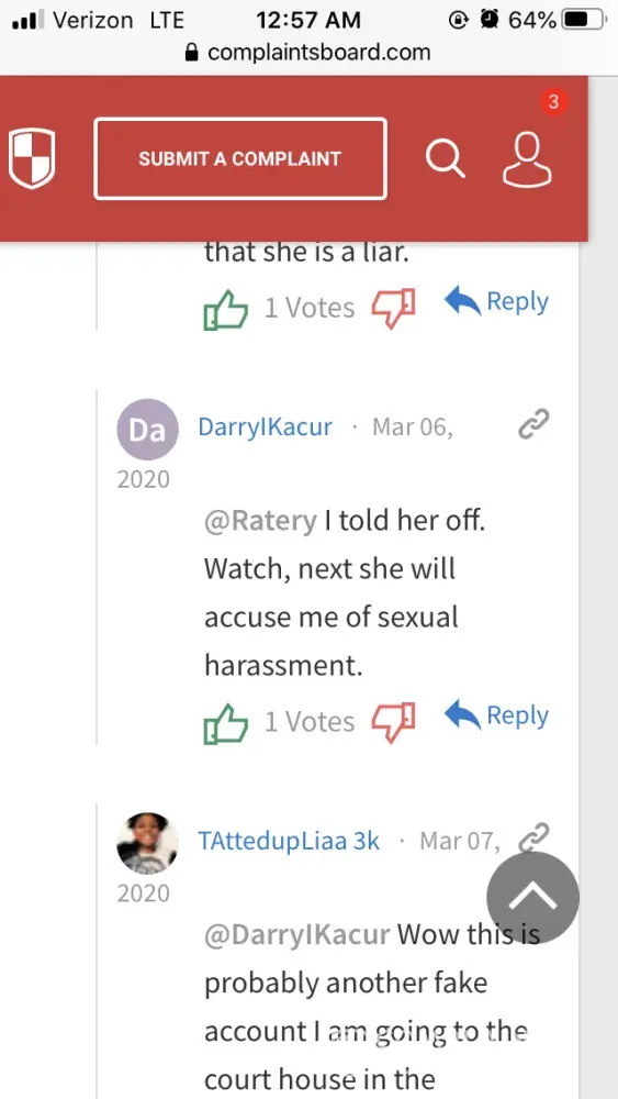 Bruh this is insane me terry keeps using the fake complaint board accounts pretending to be me againnnn I'm am so done with this [censored] the statement below in the picture I did not write ms Terry DID she has a fake complaint board account pretending to be me she keeps changing the name first it was 3kx then TAttedupaa 3k now she has changed it to TAttedupLiaa3k with a different font I'm so damn tired of this and she ms Terry did SEXUALLY HARASS ME SHE DID SHE SHE DID SHE DID and I never lied about anything she did touch me AND please check the cameras bye I'm giving this to god