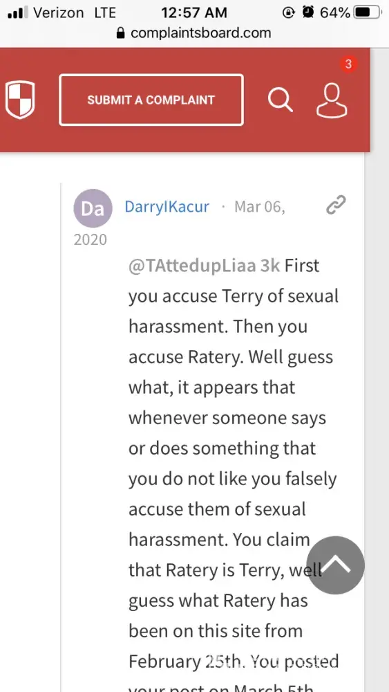 This is I mahlia rejae Sampson everything I said in my first original statement was true the fake account ms terry made which was TAttedupLiaa 3kx was not me she now has changed it to tattedupaa3k and keeps changing the name and I had an original statement I wrote on an account that I lost my password to it says at the bottom of that statement that I mahlia rejae Sampson did write that statement and now she is using that account name that I lost the password to which is mahlia Sampson to try to pretend to be me and say and deny that she didn't touch me when I already said that she DID touch me multiple times and that I was never ever ever ever ever going to change my story the picture below the first one is the account I lost my password to and had already made a statement on it and it says 0 comments and 1 compliant now ms Terry has used that name to pretend to be me you will see down below you can click on where she put @readet and see that That is a fake account she made using my name mahlia Sampson the name of the account that I lost my password to and had originally made one statement on And had zero comments on the fake account The fake account she made does not have that written statement on the profile it only has 9 comments she commented saying I made it all up and I did not make anything thing up She did sexually harass me you will see that there are two mahlia Sampsons and the account I lost the password to only had a statement I written with no comments you will see the difference and seek out the fake account the third photo is the fake account ms Terry made and following that third photo the 4th one behind it is the other fake Account she made Which was originally TAttedupLiaa3kx but she changed it to tattedupaa3k and keeps changing it to try to cover herself up the fifth photo is the false statement that ms Terry wrote and she made with the fake account which is photo 4 that I Mahlia Sampson did not write and now she has made another fake account named @Darrylkacur pretending to be a guy this time and you will see she keeps saying @ ratery is not Terry when it is ms Terry and you will see it says " @ratery I told her off"so tell me why would she say @ ratery if she kept saying it wasn't ms Terry and you can also see on one of the photos she comments as @Ratery and says " why would you lie about something so serious " she also has another account named @Readet you will see below all of it is posted the next 9 photos are just proof she has made multiple accounts and is trying to cover herself up and deny her sexually harassing me the absolute last photo is my TRUE complaint board account TAttedupLiaa3k WITH THE PICTURE ABOVE that has 4 plus complaints and 20 comments please look into this please she is trying so hard to cover up and deny her sexually harassing me and I MAHLIA REJAE SAMPSON AM NOT CHANGING MY STORY EVERRRR