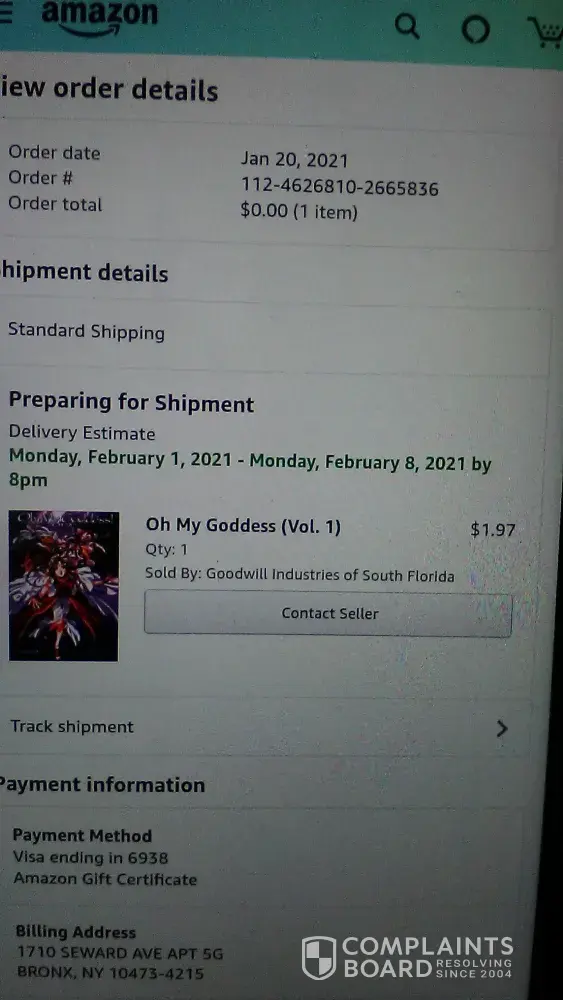 I've order on January 20, 2021, Order# [protected]. Item name Oh my Goddess Vol: 1: Amount is $0.00. pay It with a Amazon Gift Card.
