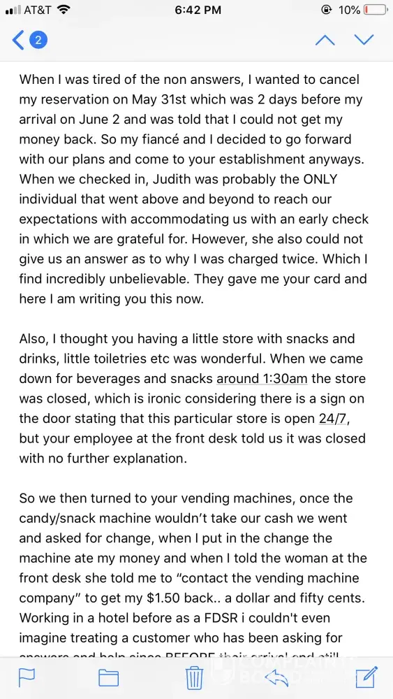 Also, while staying, there is a 24-7 store inside the hotel, at 1am when my fiancé and I came down for a drink and a snack, the woman at the front desk said it was closed, I was able to find a vending machine (no help from her) and the machine ate my money, when I went to complain to her she stated "you will have to call the vending machine company" and never looked to us again or guided us further. It was a piss poor experience and I need someone to contact me about this. I will never stay here again, and as someone who travels to orlando often.. I have never been treated more like a burden in my life. I will happily provide the bank statement I had for the double charge, yes I know it says "pending" but I still wasn't given an answer as to why this charge happened.