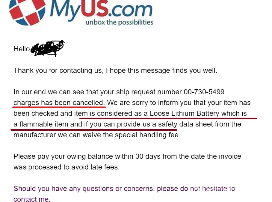 I have complained multiple times about this shipment that we incurred inappropriate charges as products were misclassified. The consignment contains items with a specific lithium-ion battery that MyUS have inappropriately classified as dangerous. This is ignorance as the specific closed type of battery part of a consumer device is not included in the particular industry definition of hazardous goods. The items have been thoroughly tested and certified by the manufacturer, and these data are in the public domain. Furthermore, I have discussed whether the specific product would be classified as Dangerous with the manufacturer and the courier. They all said that they do not classify them as such. The manufacturer/retailer does not charge such fees when dispatching the items directly. The shipping partner does not collect such fees to transport the items to the UK simply because this type of good is no more dangerous and does not require any special handling.
