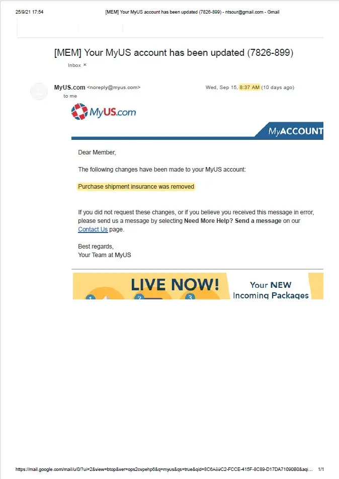 I am attaching two emails as Exhibit 3 and Exhibit 4. Exhibit 3 proves that I removed the default option to include insurance on the 15/9 at 8:37AM. Exhibit 4 shows that the package was shipped at 15/9 2:27PM, many hours after I removed the insurance option. But they still charged me 8.97USD