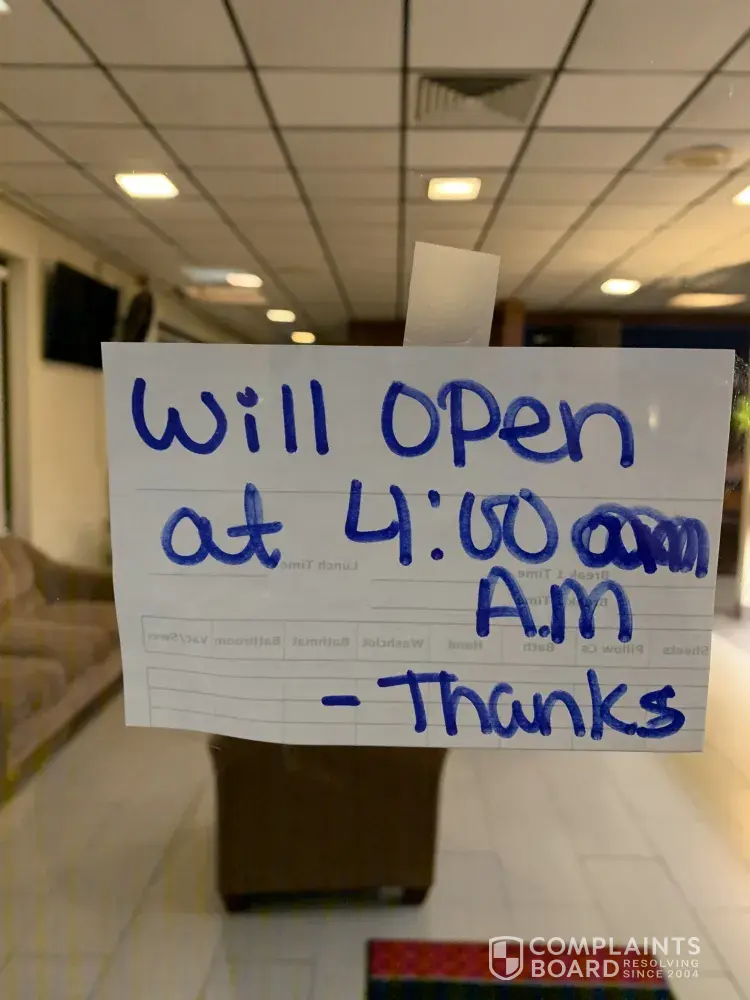 I'm a guest here I got off work at 630 am, my room key isn't working so I came to the office and there's no one in the office they have a note on a door saying they would open at 4am and it is now 740 am and still no one has shown up...