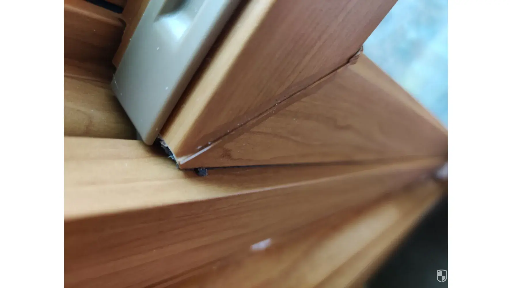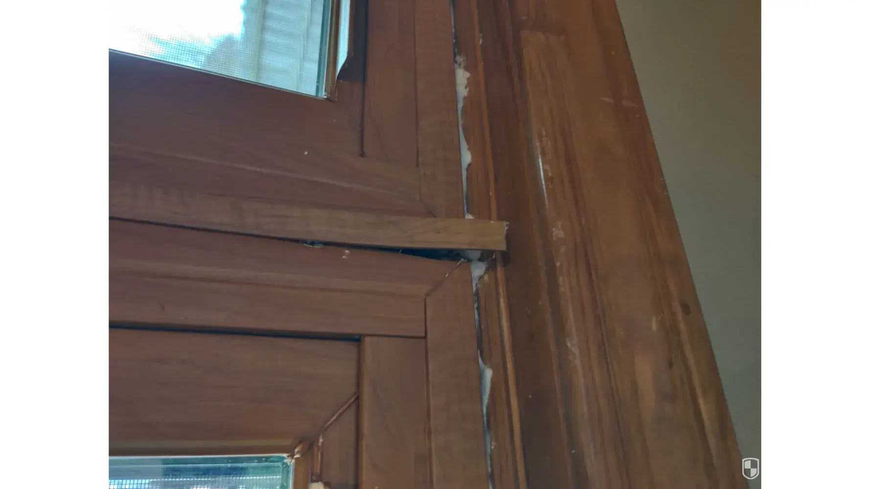 4 - I don't know what the piece is called, but between 2 large windows in 1 big opening there is a piece that was installed too low. Doesn't cover the top of the portion between the 2 and is so long at the bottom it doesn't sit correctly. On the outside of this same piece, it is cracked.