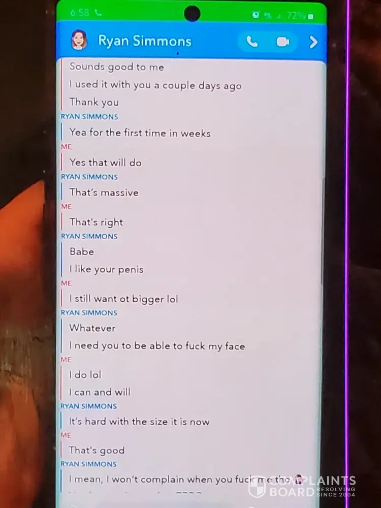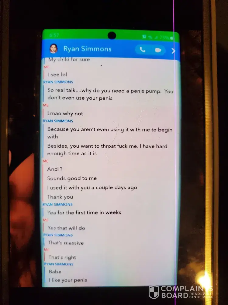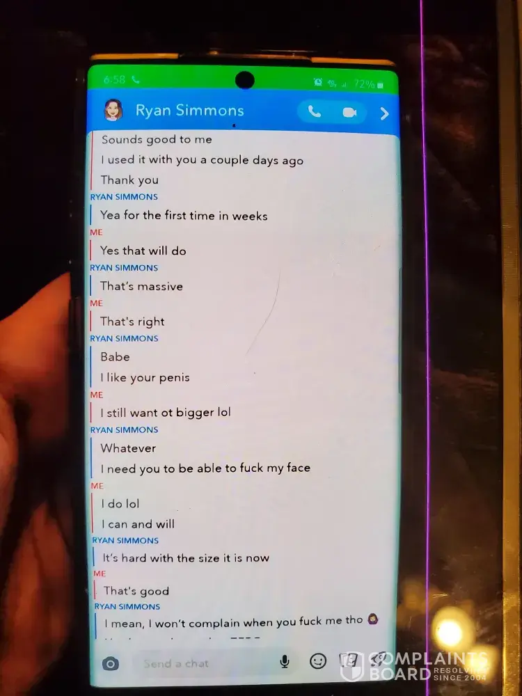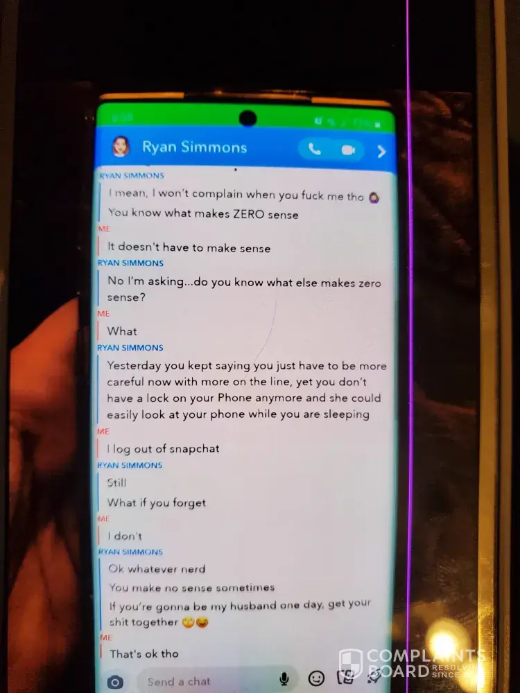 Kayla Stark is having sex with her Client which is my husband Jason Bragg in her office. I have pictures of their snapchat messages. On snapchat you can change anyone's name, so my husband changed it to a man's so I wouldn't know. Kaylas snapchat username will be in the photos. Her name appears as Ryan Simmons. The me is my husband talking. Kayla is in the blue. They talk about having sex a week ago. My husband had went to being her papers and I guess she locked the does and had sex in her office. My husband admitted to me that they had sex in her office. I think this is very unprofessional and I'd like someone to handle this situation. I have plenty of photos to show you how she was talking to my husband her client about marriage and like his penis and face [censored]ing. She is also married and pregnant. I just want it known that her actions and behavior isn't professional. I've already made a verbal complaint. I don't think she should be talking to clients like this or handling people's money.