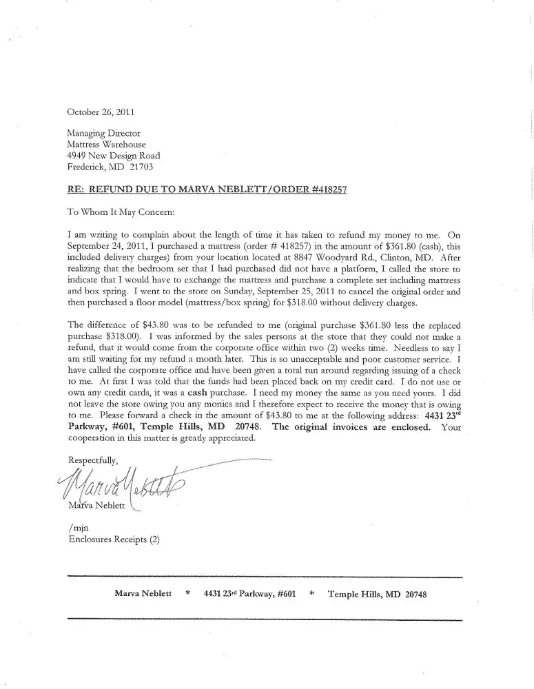 I then made a payment for $20.00 on 8/18 after finding a receipt from MW. I then inquired about cheaper mattress sets. After receiving no help, I purchased a mattress set. One that I could afford. I contacted the current manager, Nick and asked for a refund. He stated he'd cancel my order and send it to the main office for a refund on 1/12/2009. He later called me on 1/14/2009 stating that I could not receive a refund and either had to lose $190, continue with the layaway INDEFINITELY (I only have a 1 bed apt and no family in the area) or give the $190 to someone (in effect, lose $190).