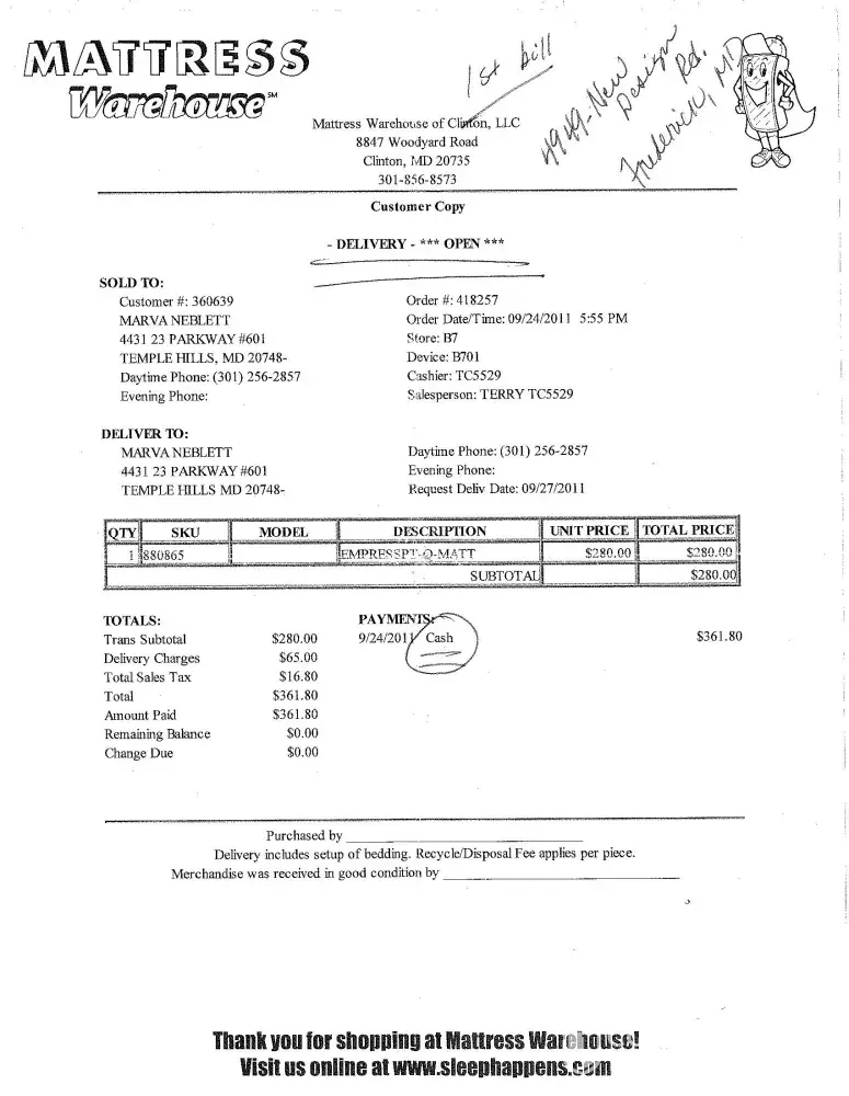 On March 11, 2009, My daughter purchased a mattress and she paid cash in the amount of $629.99. She was very excited about being able to pay for her purchase in cash which she worked very hard to save. The Manager at the Front Royal Mattress Warehouse, Debbie was very quick to take this young womans cash and promise her a delivery date less than a week away. I also purchased a Mattress Pad that Debbie suggested to protect and guarantee the guarantee, of the mattress, in the amount of $83.99 (this was put on my Credit Card).
