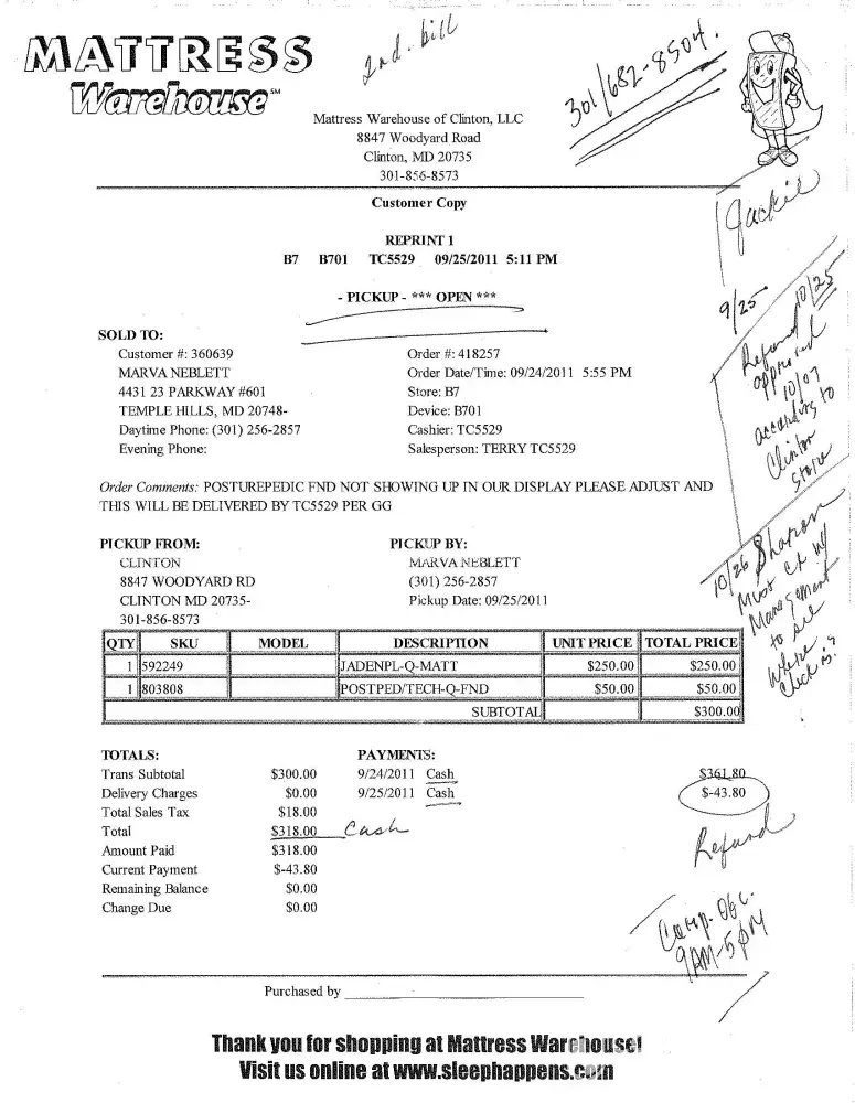 I just got off the phone with Mattress Warehouse in Frederick, MD to notify them that I no longer need the bed or bedding that I purchased yesterday. I have the mattress pad in my possession, but the bed was to be delivered in 4 days. He told me to come into the store to get the refund on the bed, but he will not accept the return of the mattress cover ($150)...even though it is UNOPENED. What's up with that? I am at PhylCrane@gmail.com if anyone wants to discuss.