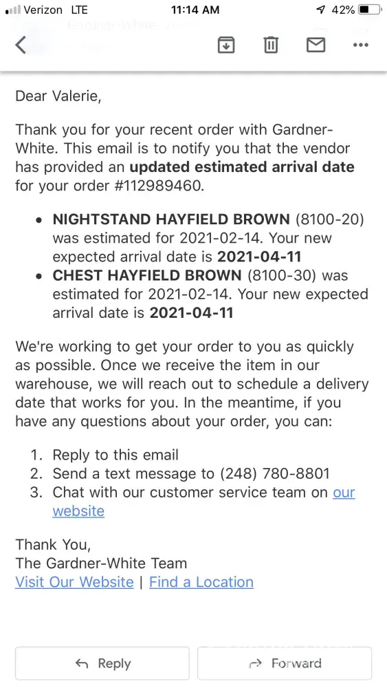 I'm sure if I continue to sit back and wait I'll eventually get my items, maybe April, or September, or maybe 2022... all while GW has happily accepted my payment in full 4 months ago with no real urgency to deliver and no refund options. Absolutely disgusted with Gardner White. Word of mouth goes a long way, they clearly don't care about the people who pay their salaries!
