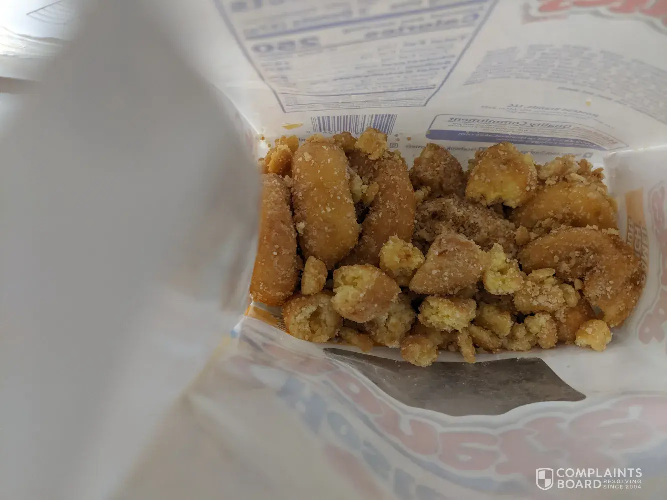 I purchased the bag at a local convince store at 4:50 am. Took them back to work and opened the bag to have a couple of the donuts. I took the first 3 out of the bag, they were whole but looked in the bag and all the rest were crumbs. Very disappointed and dissatisfied.
