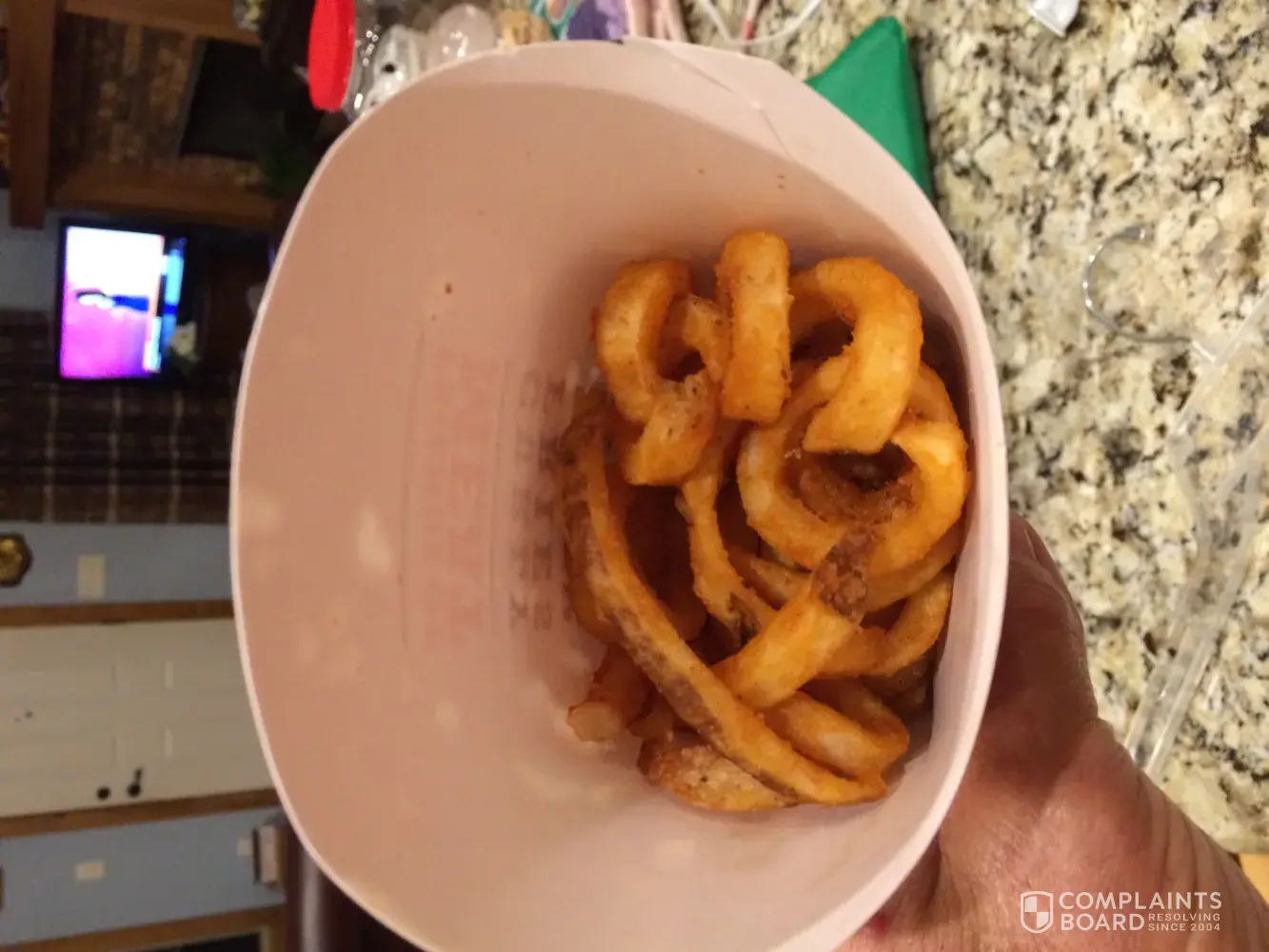 Drive there to have a late meal after taking care if Ill relative. It was getting close to closing time. One other customer there. She had ordered something that they had to cook and when they gave her the order I heard them tell her they gave her all that was cooked for free. They were cooking a whole cooking of curly fries also. I ordered a sandwich and a large order of curly fries. They filled my order and I left. I had to drive 15 miles to get home. When I opened the bag I had a large container made for a large order of curly fries. It wasn't enough fries to cover the bottom of the container. I had driven all that way and didn't get near what was ordered. The