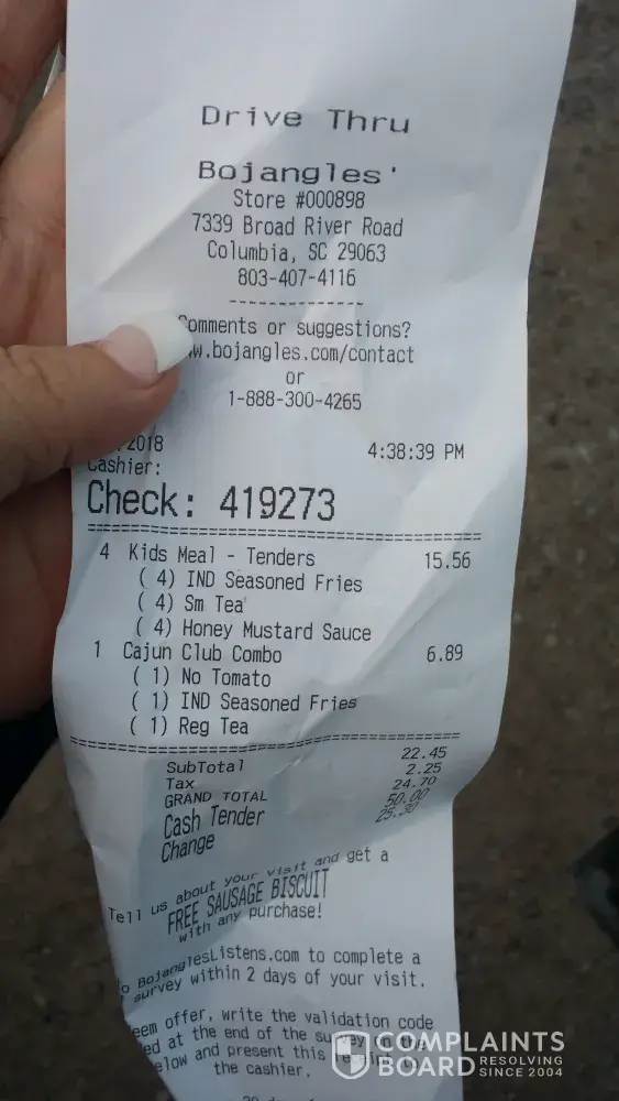 View all 90 complaintsBojangles’ International / Becajun.com - fish sand