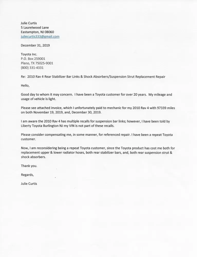 Please see attached invoice, which I unfortunately paid to mechanic for my 2010 Rav 4 with 97339 miles on both November 19, 2019, and, December 30, 2019.