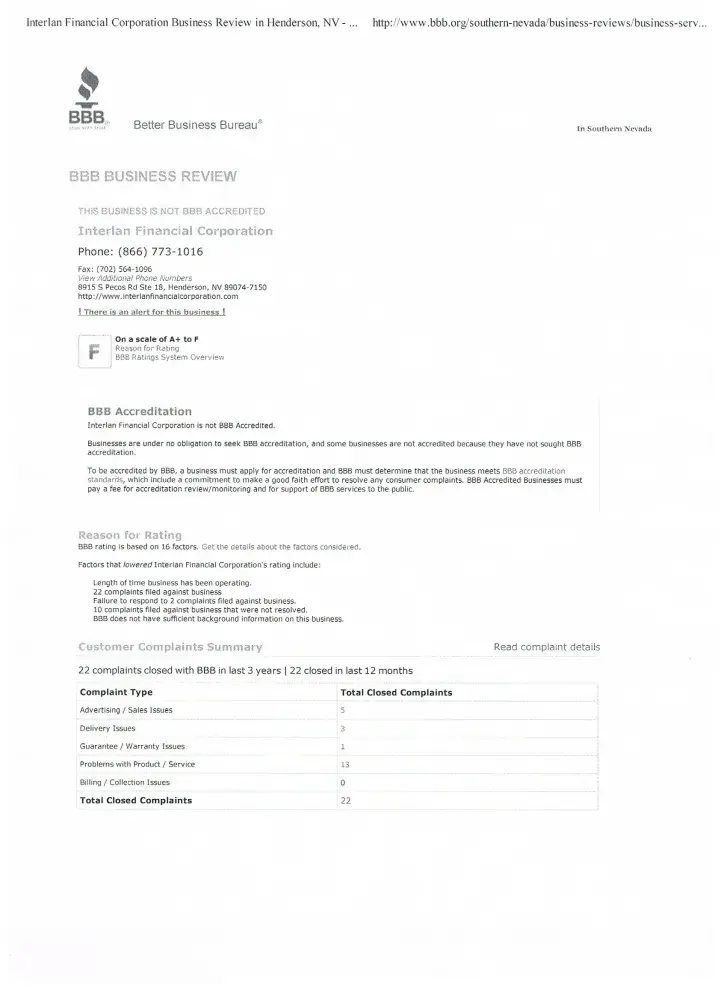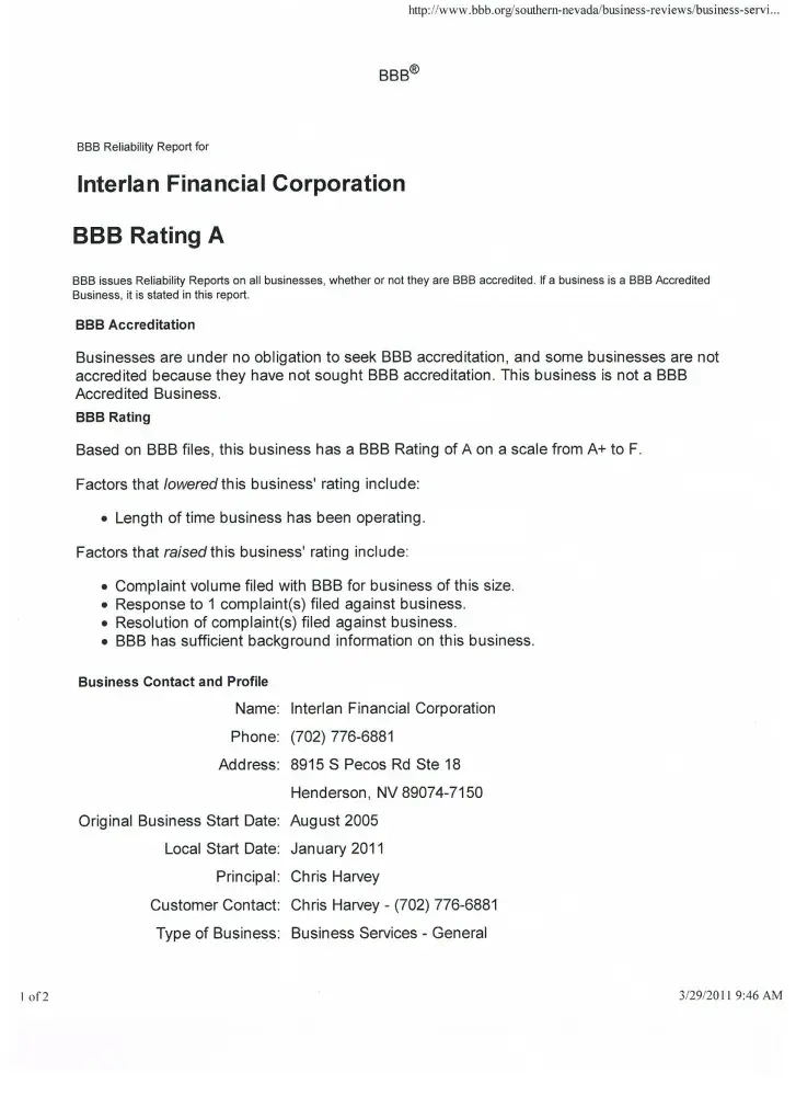 Please see the BBB history. You can see that Interlan did have a BBB rating of an A when they first changed their name from Compass to Interlan. Please contact the Southern Nevada BBB and they will verify all information I have attached is in fact true.