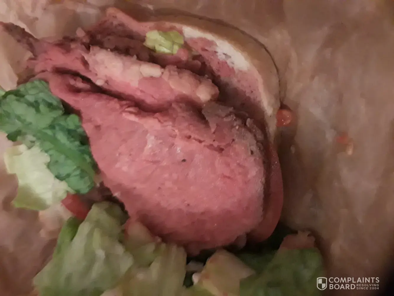 On Monday the 10th of this month, I made two orders of the steak and arugula sandwich to take home. When I got home, I discovered that the steak was about 99% raw with noticable blood from it that had dripped onto the bread. It looked gross. I was so upset because I was hungry, already back home and had nothing else to eat. I called that same day to make a complaint and was told my complaint had been written down and that I could come back the next day to either get a refund, or have my order made again.