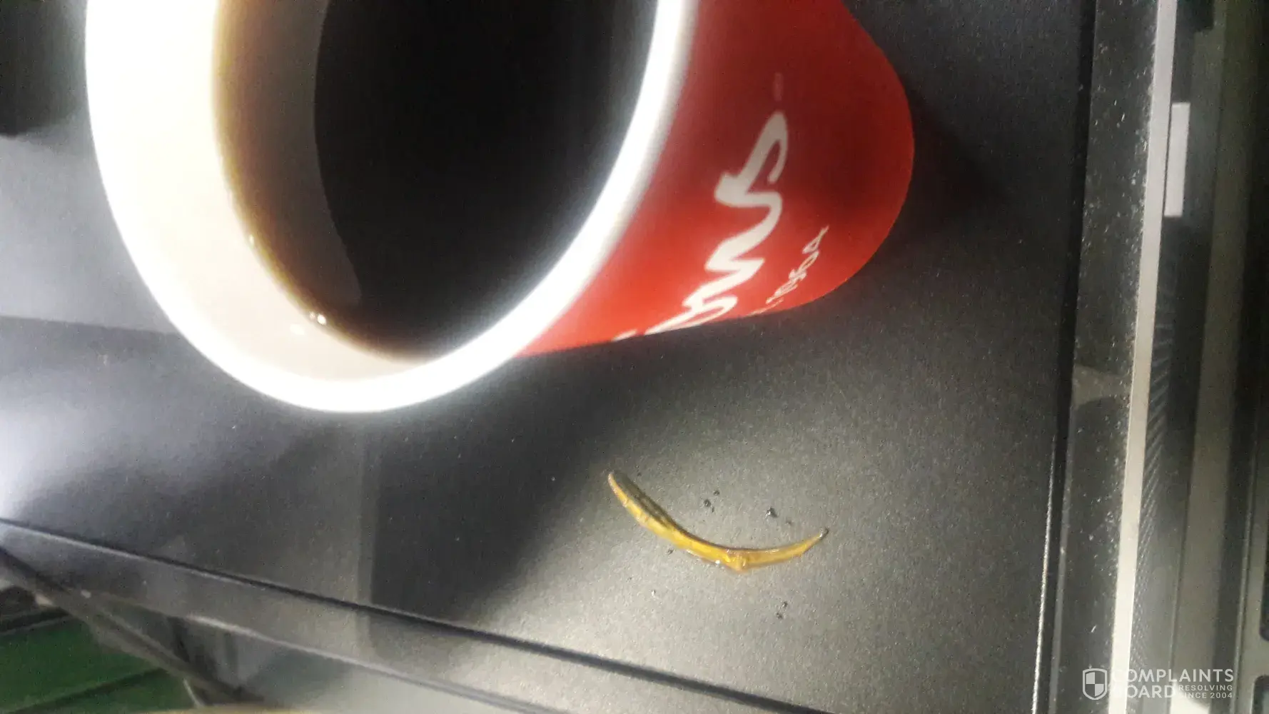 I'm wondering what this could possibly be that I found in my coffee yesterday morning. I've been going to Tim Hortons for years this is my first time ever experiencing this. If they're wondering who I am I was a customer who ordered three coffees one medium black 1 medium 2 cream 1 sugar and one medium double double with caramel. I came between 6:50 a.m. -7:10 a.m. I would have just came in this morning to complain to them but every time I go in there the line is usually to long. Absolutely disgusted but I know stuff happens i used to work a Tim Horton before. Thanks