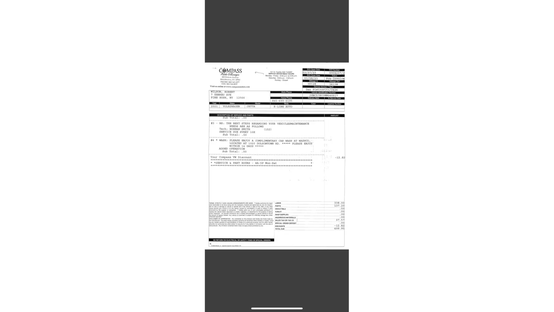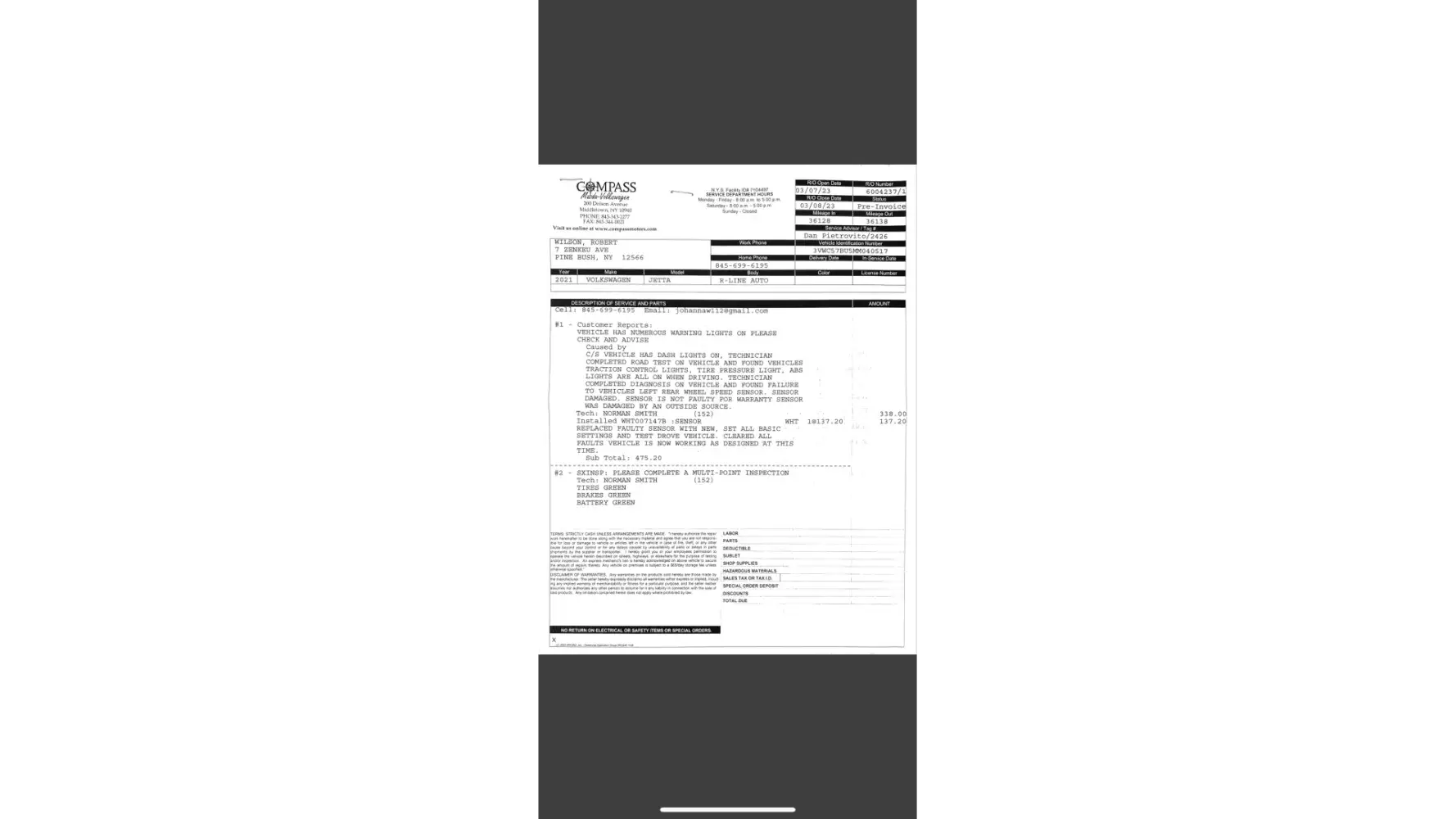 COMPASS VW replaced the damaged sensor and set all basic settings and tested. The charges incurred due to the damage done to my car total $499.95. I’m a 21-year-old full time college student. In the span of a week, I spent $1,694.27 on my car!