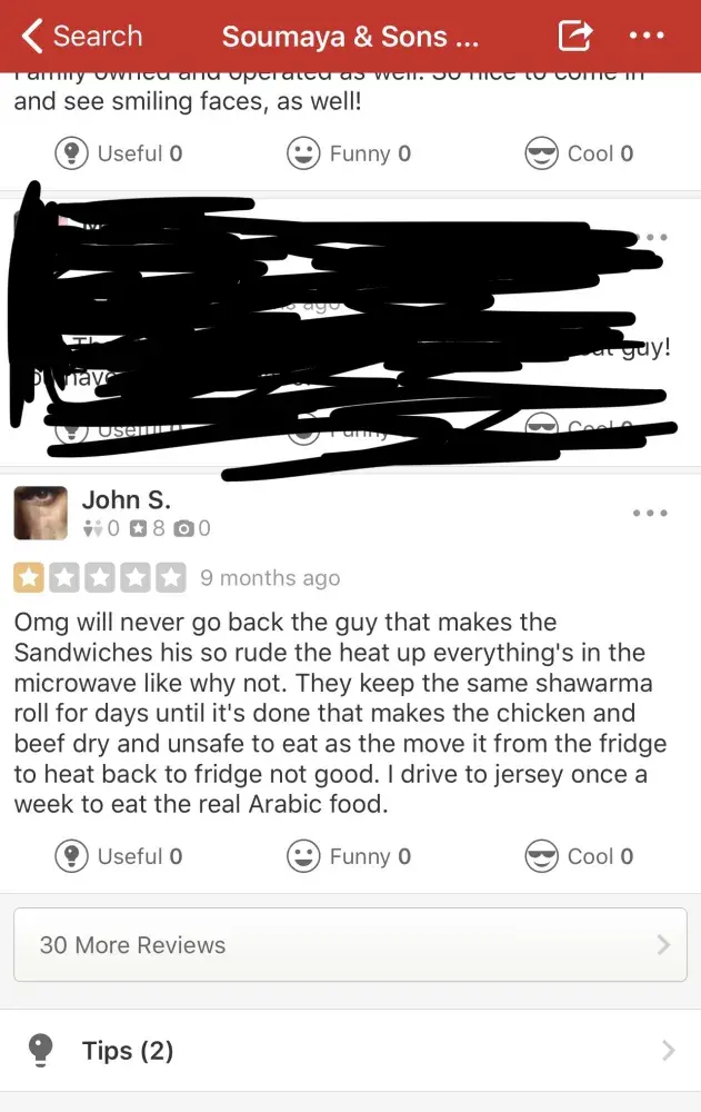Hilarious this is yelp everything people are saying! So here is more proof for any doubters! Yes sure if u never had real authentic Arabic food you most likely will like it! However there is way better and with less bs and with out the possibility of being disrespected by a rat and liar Jason Ballan! So this is someone else who feels like me on yelp one of the hundreds who have stated this and Souymaya has paid to have deleted and only leave all the good reviews up!