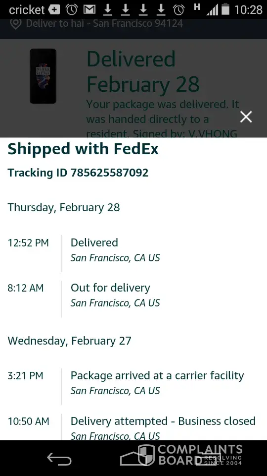 On February 21, 2019, I have bought one plus 5 Android phone from NGP Store USA(order# [protected] and tracking# [protected]) I waited for this item to arrive to my house but nothing came. So then, I filed a claim on March 7, 2019(which was closed) and an appeal on March 22, 2019. I waited until April 8 and they did not get a response from FedEx facility and also case is opened still(case# [protected]). Craig said that he do not know why was it opened when claim is already denied. See attachment. That person that received my package had to be wrong house because my place is not a business. It was trying to deliver to a business place and then on the following day the delivery man stated v. Vhong, who is not my member of residence received this package. No such last name as vhong.